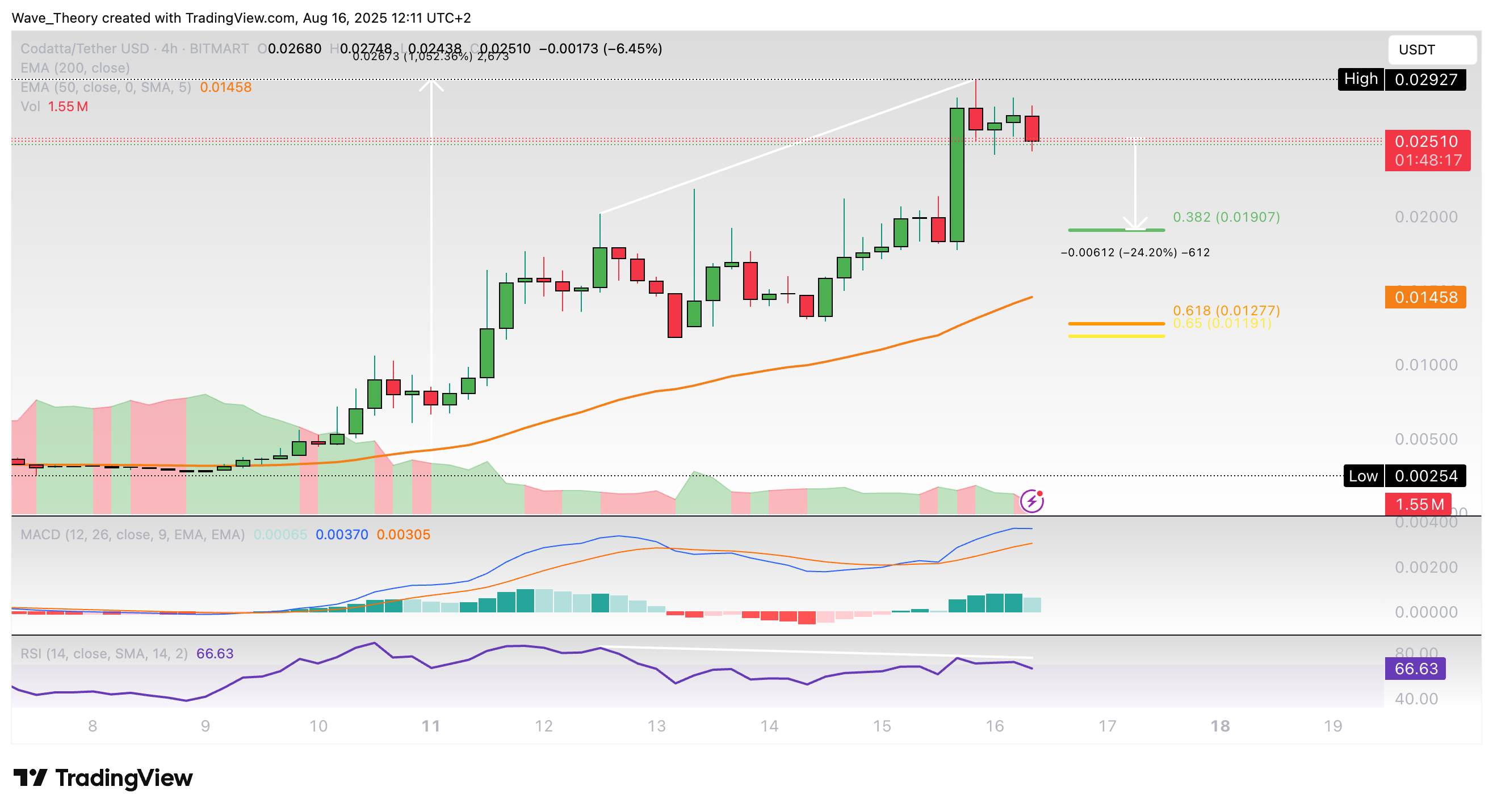 Seit letzte Woche Donnerstag ist der Kurs von Codatta rund 1.052 % gestiegen. Seit er auf der Börse Bitmart gehandelt wird, ist er sogar um fast 10.000 % gestiegen.