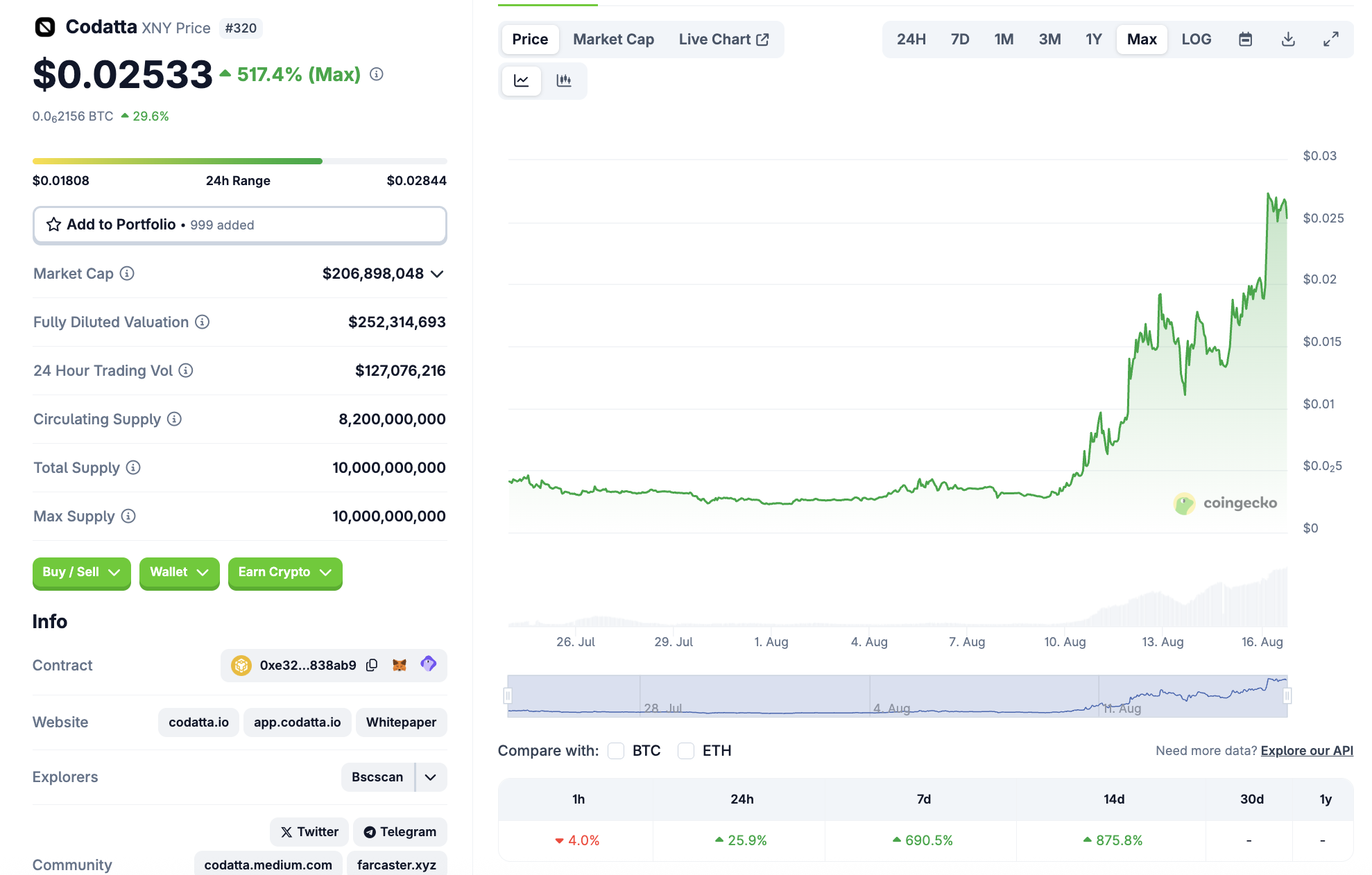 Der Coin Codatta (XNY) ist seit Donnerstag letzte Woche rund 1.052 % im Kurs gestiegen