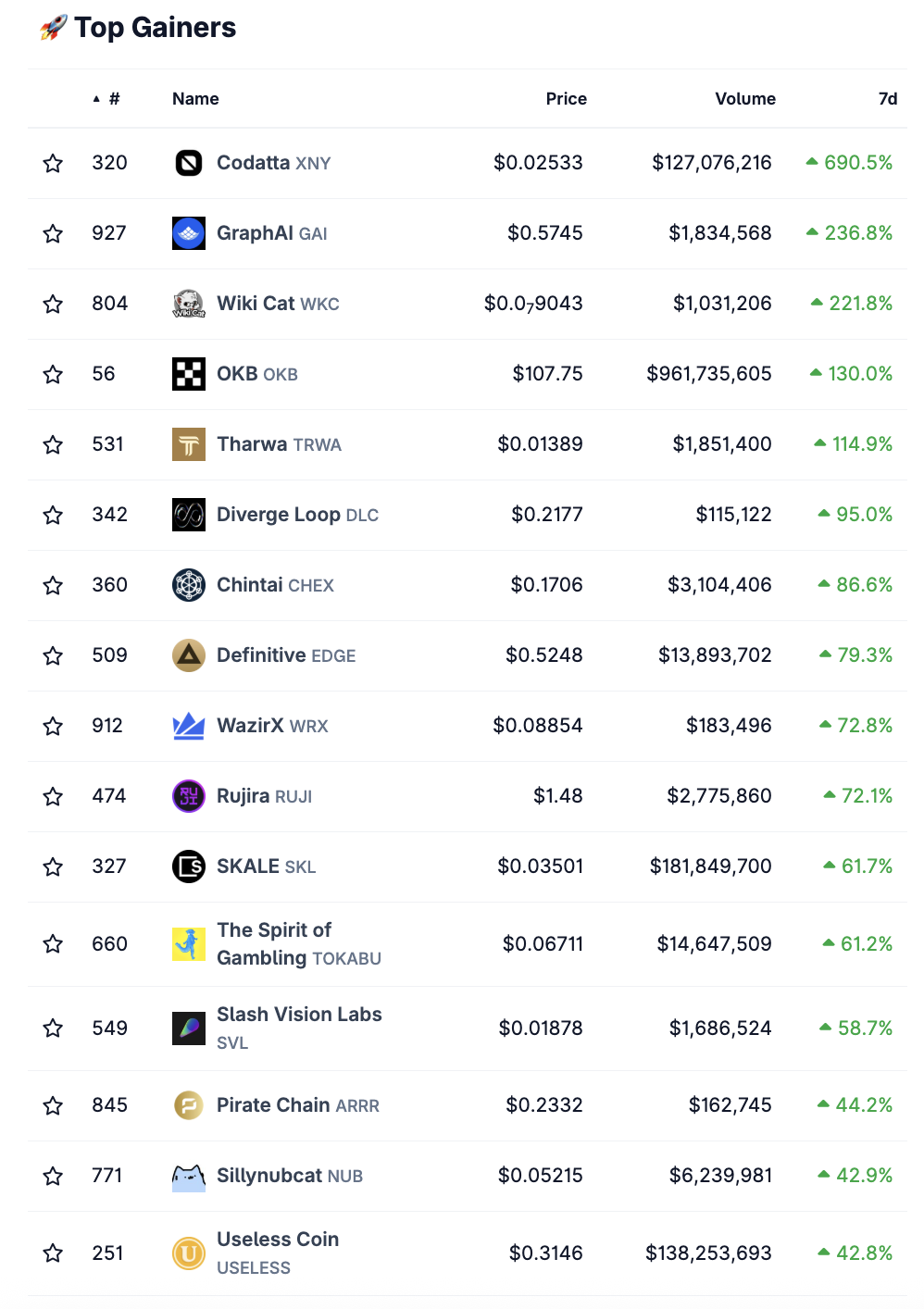 Der Coin Codatta (XNY) belegt in dieser Woche den ersten Platz der Top-Gewinner auf dem Krypto-Markt. Laut Coingecko ist er dabei rund 690 % innerhalb der letzten sieben Tage gestiegen.