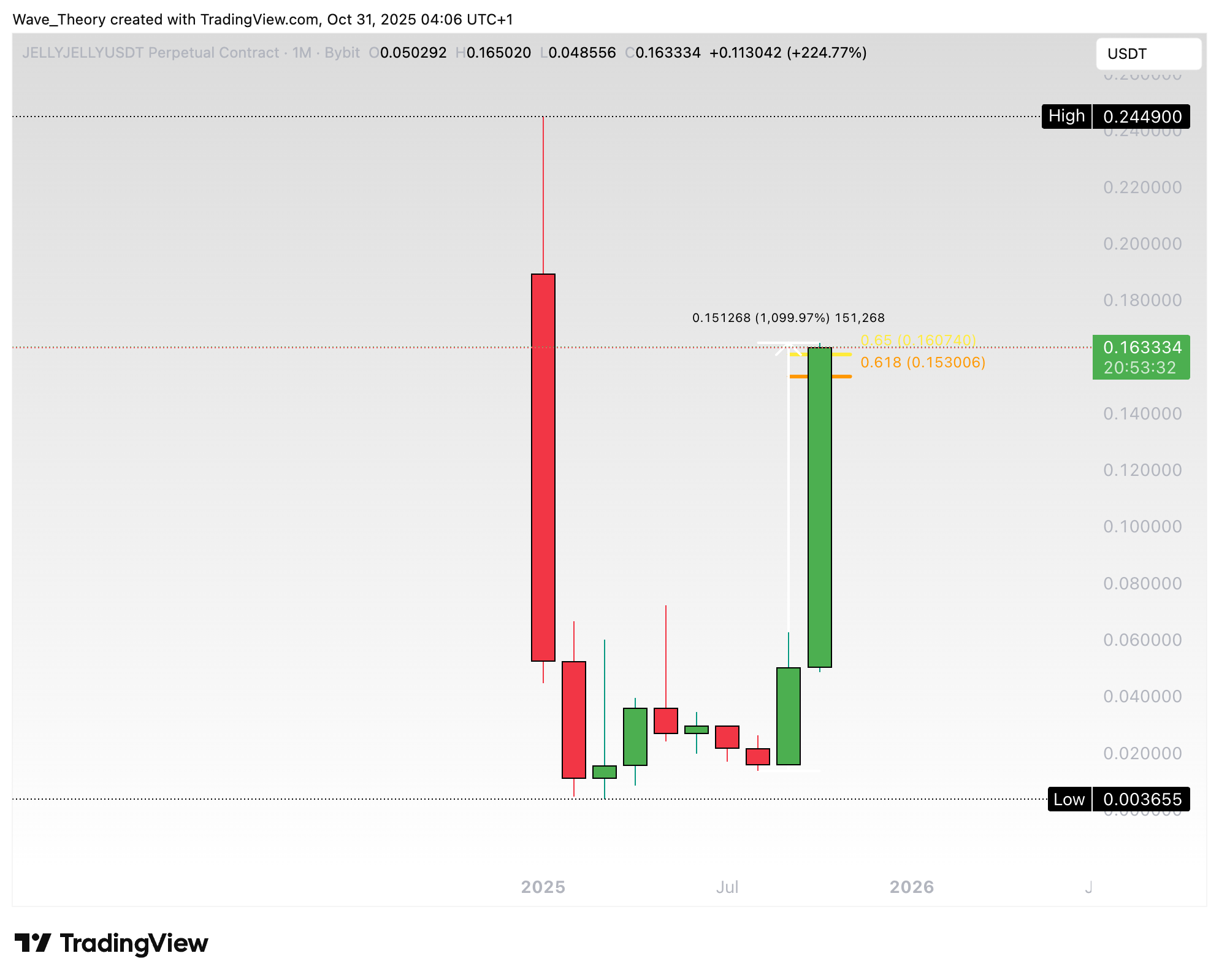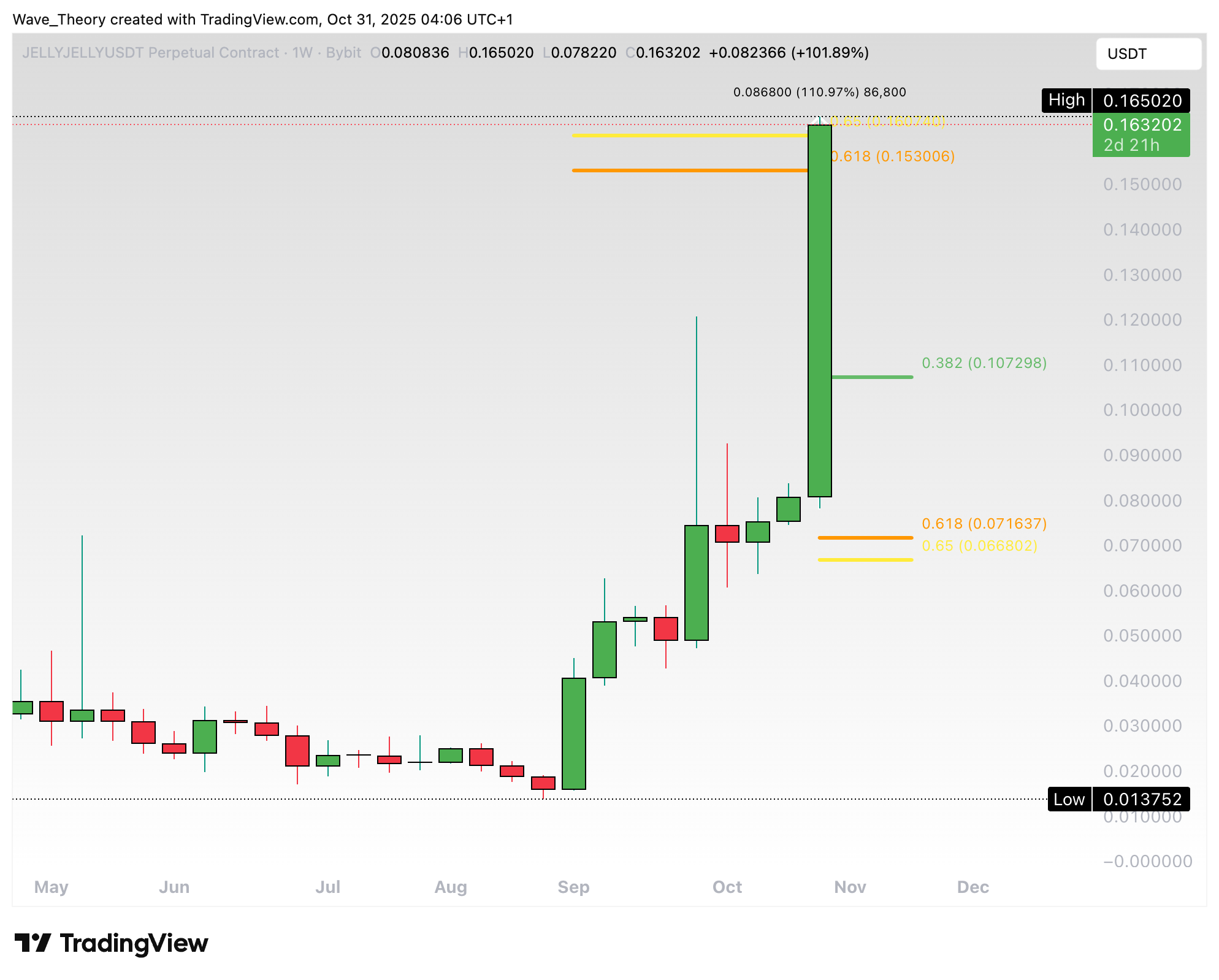 In diesem Monat ist der Kurs von Jelly-My-Jellly rund 1.100 % gestiegen. Damit befindet sich der Kurs jetzt am Golden Ratio Widerstand bei rund 0,155 USD.