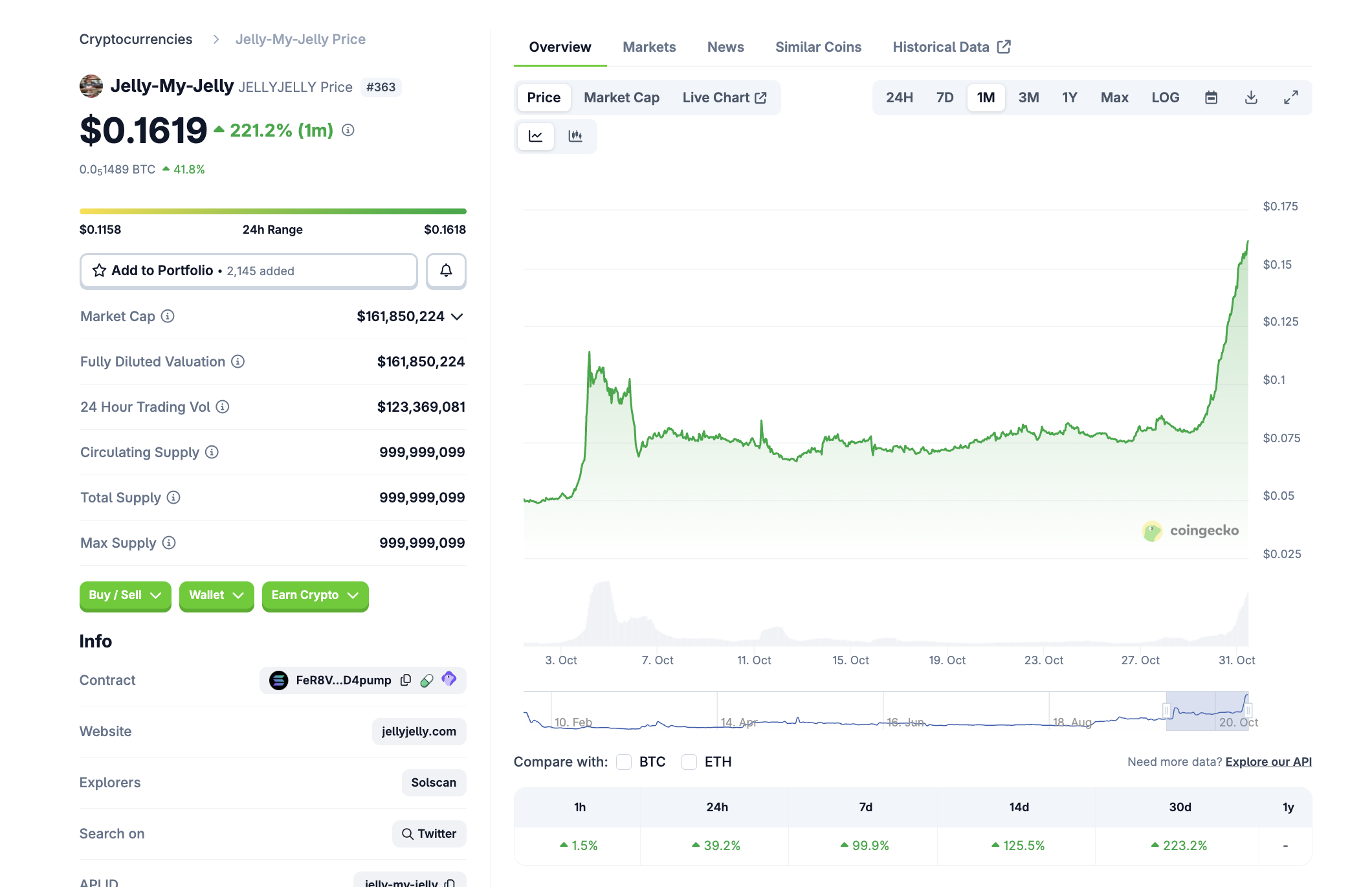 Mit einer Marktkapitalisierung von rund 162 Millionen USD befindet sich Jelly-My-Jelly (JELLYJELLY) auf Platz 363 im Coingecko Ranking. Damit ist der Coin noch sehr klein.