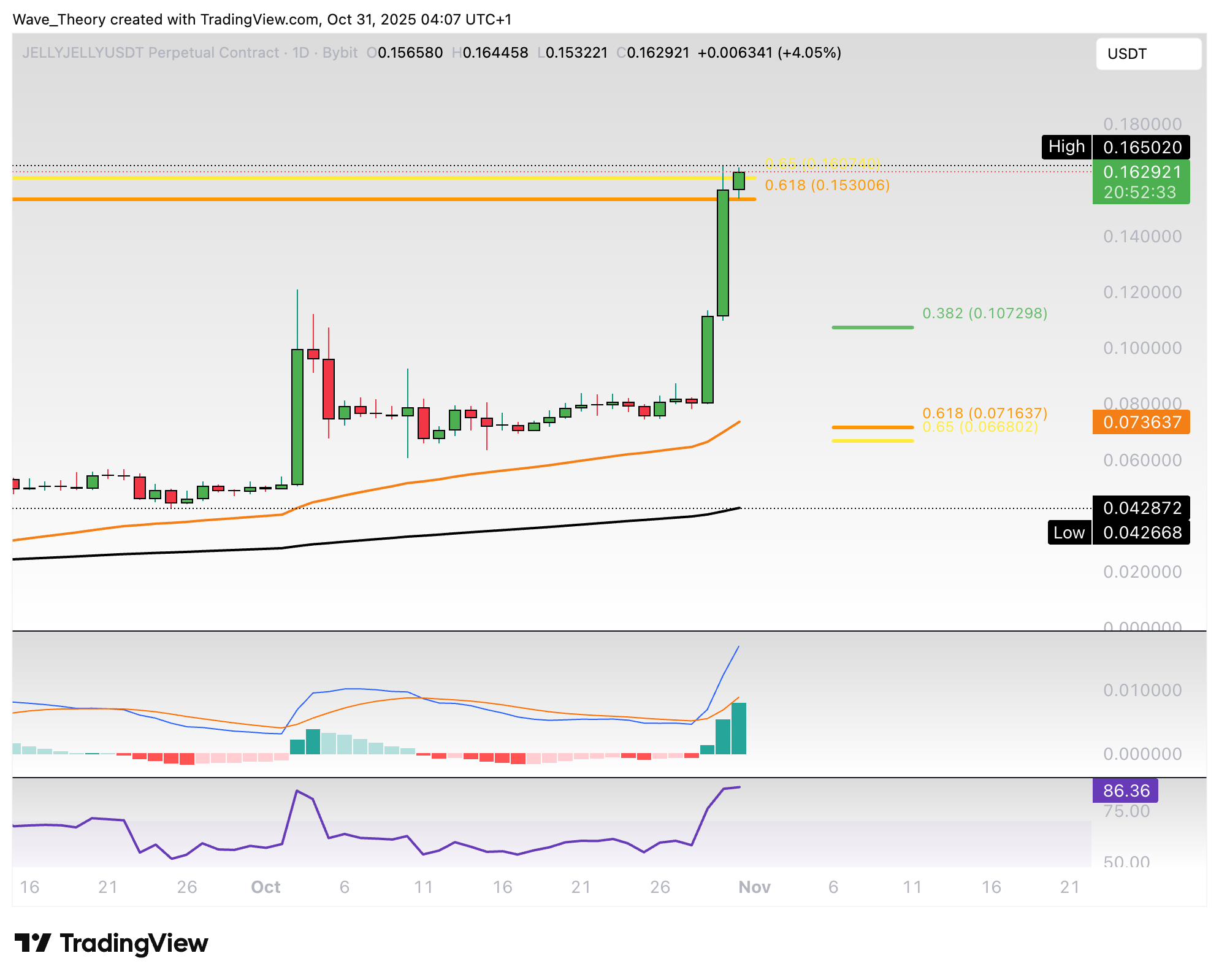 Der Jelly-My-Jelly (JELLYJELLY) Kurs könnte im Falle einer bärischen Ablehnung rund 36 % bis 61 % fallen, um die nächsten Fib Unterstützungen zu erreichen. Die MACD Linien sind aber bullisch überkreuzt im 4H-Chart und auch das Histogramm des MACDs tickt bullisch höher.