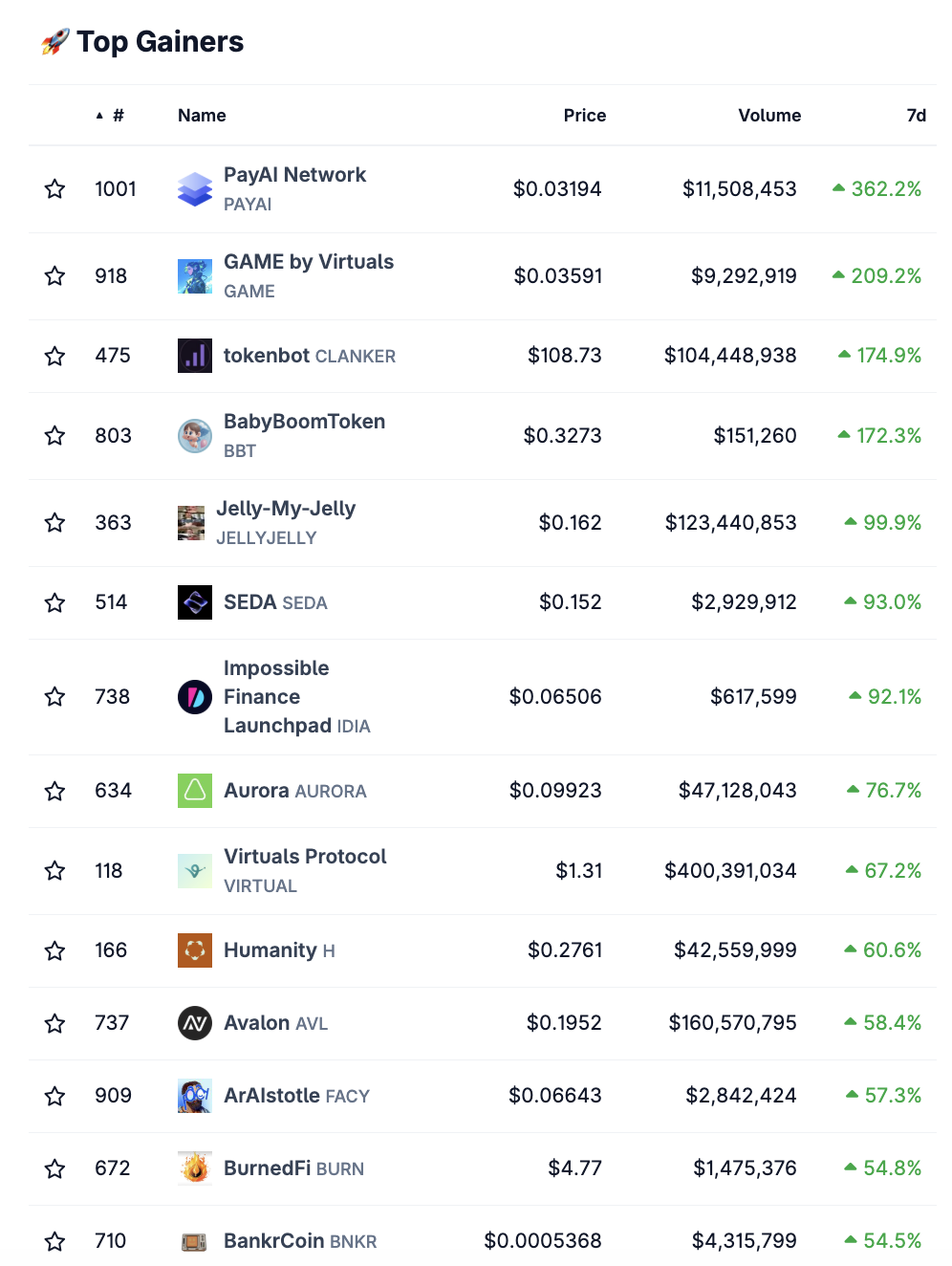 Dabei weist er auch ein beachtliches Handelsvolumen von rund 155 Millionen USD auf, wohingegen die ersten vier Plätze nur 151.000 USD bis 11,5 Millionen USD Handelsvolumen aufweisen – mit der Ausnahme von tokenbot (CLANKER), welcher sich seit der letzten Analyse im Kurs nicht verändert hat.