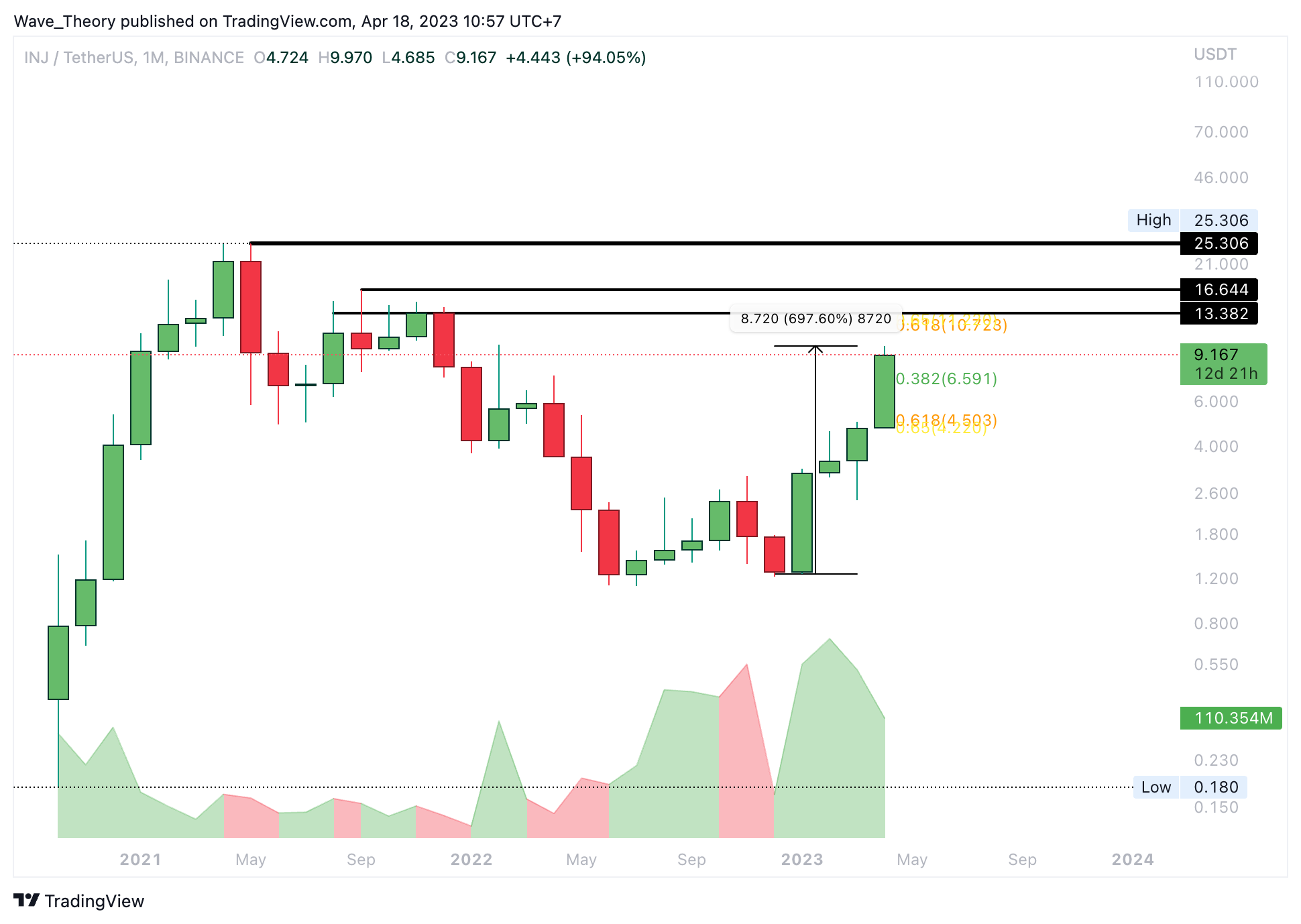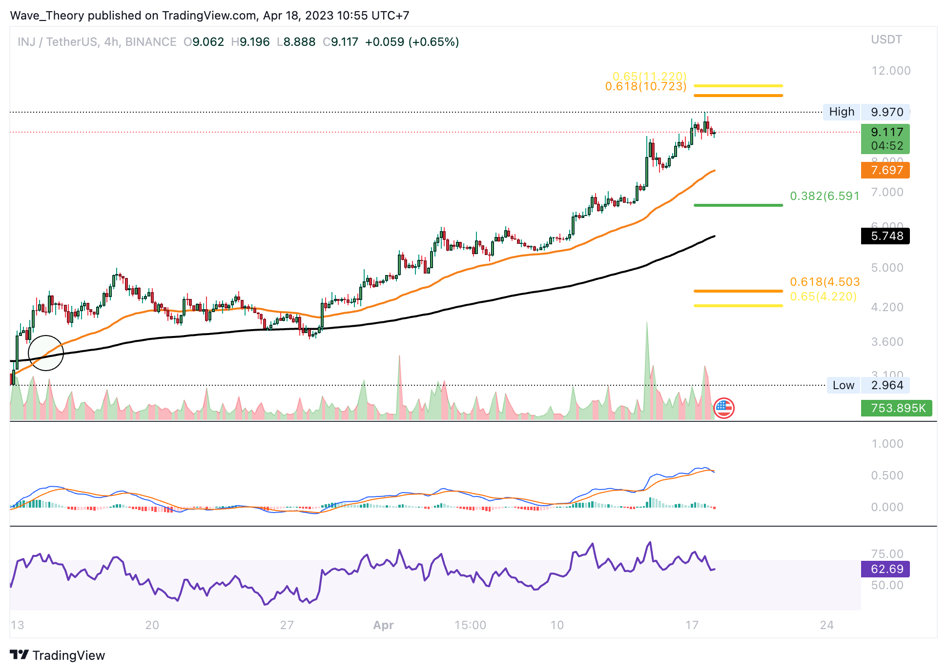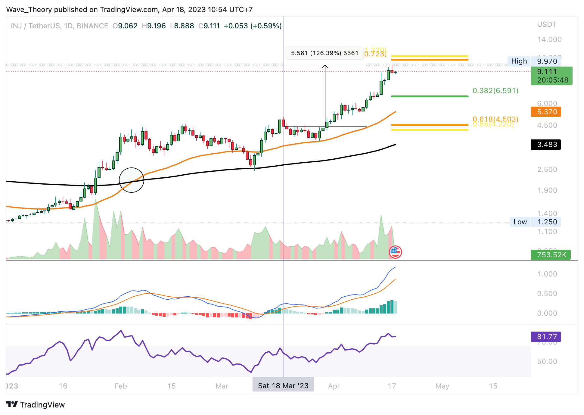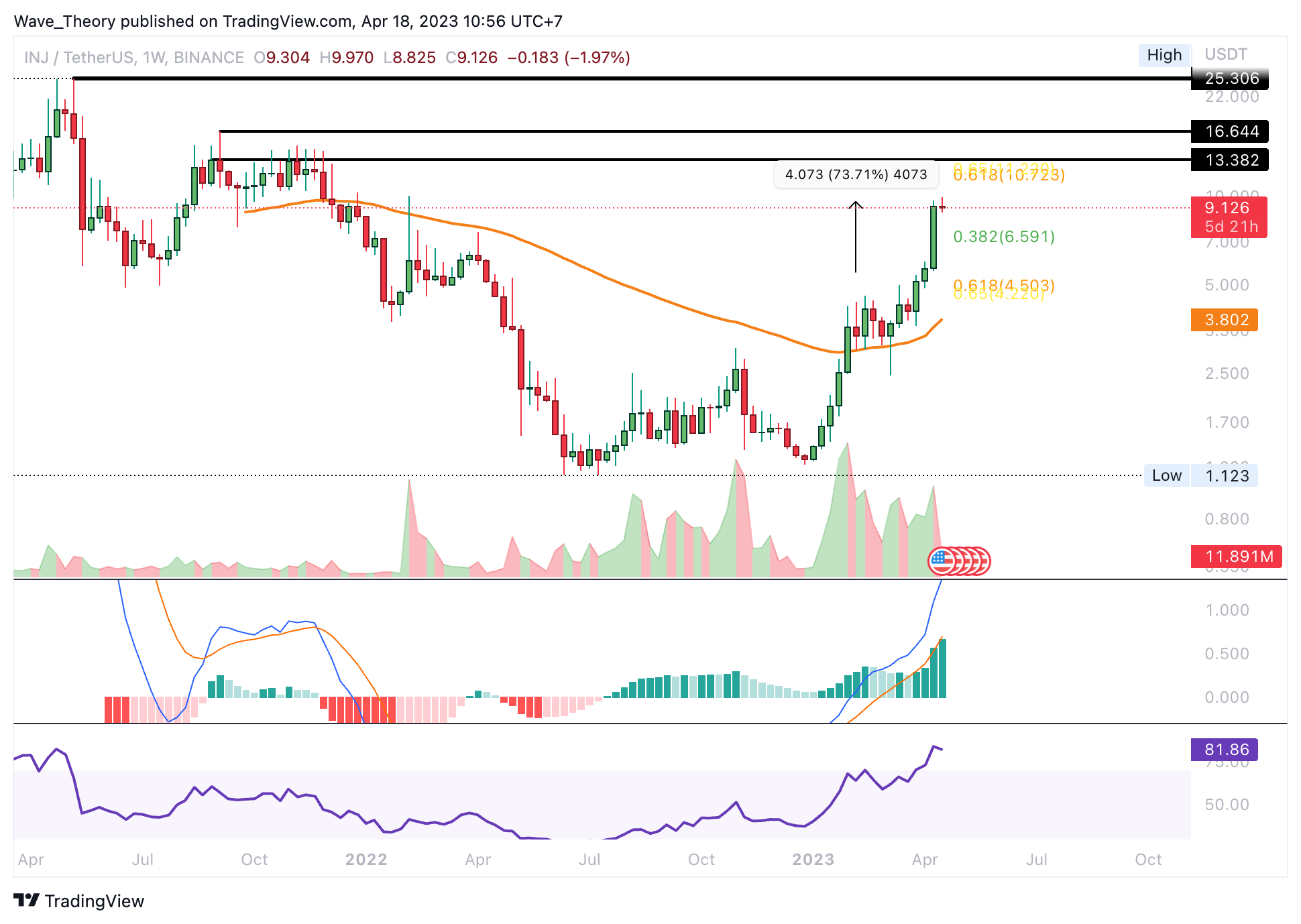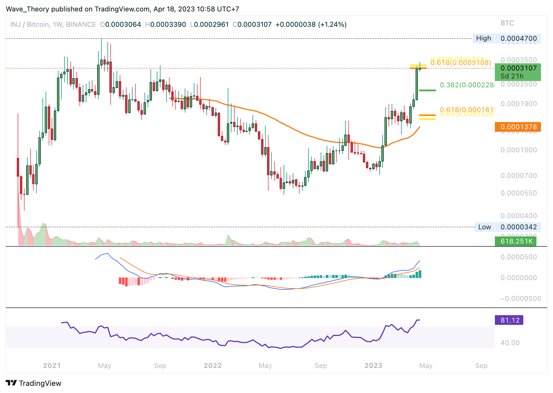 Da aber keine bärische Divergenz vorliegt, ist dies ein sehr schwaches bärisches Signal. Womöglich setzt der INJ Kurs die Aufwärtsbewegung schon bald fort, um den Golden Ratio Widerstand zu erreichen. Dort könnte INJ aber dann tatsächlich auf bärische Ablehnung stoßen, um eine Korrektur einzuleiten.