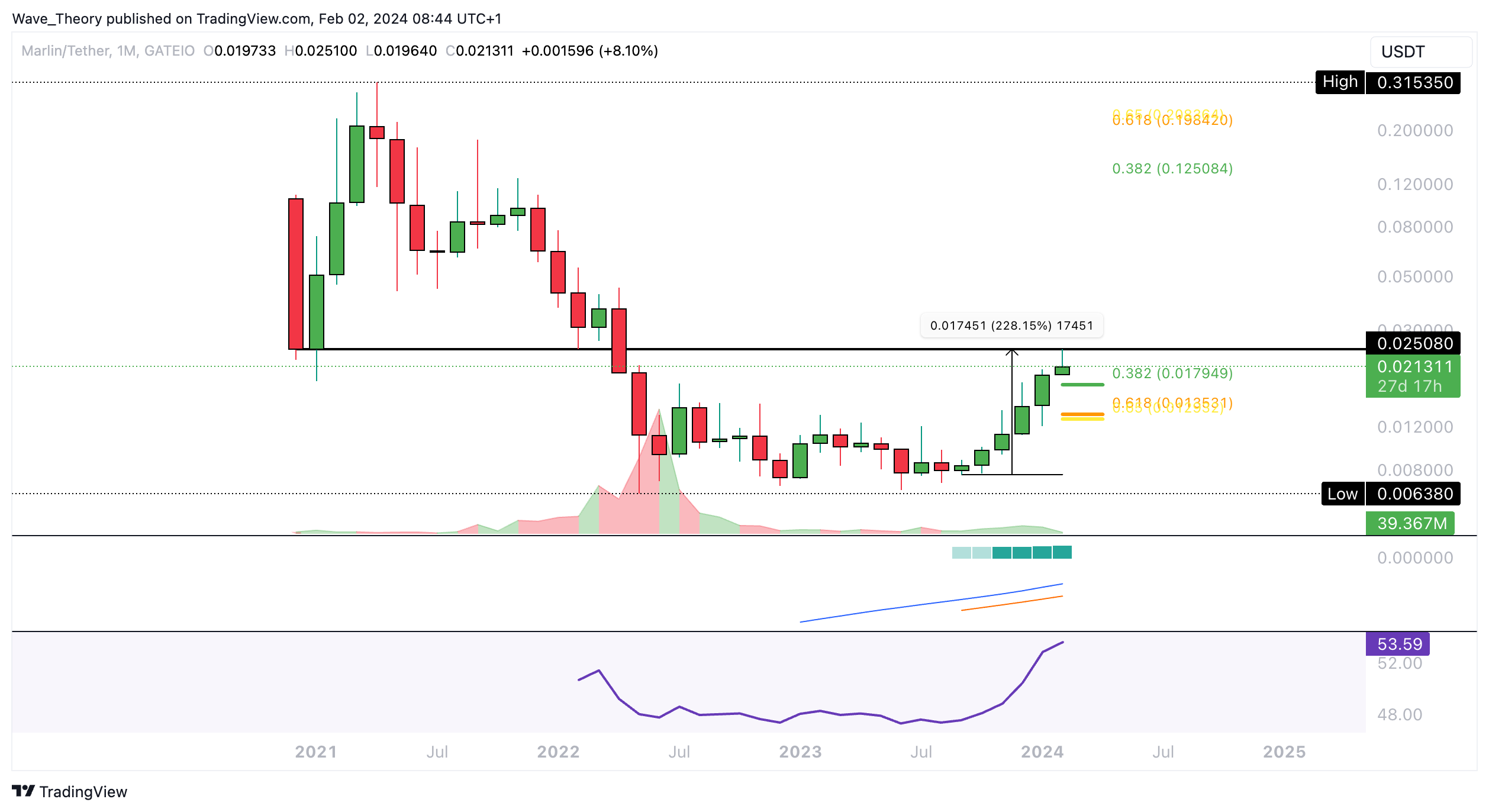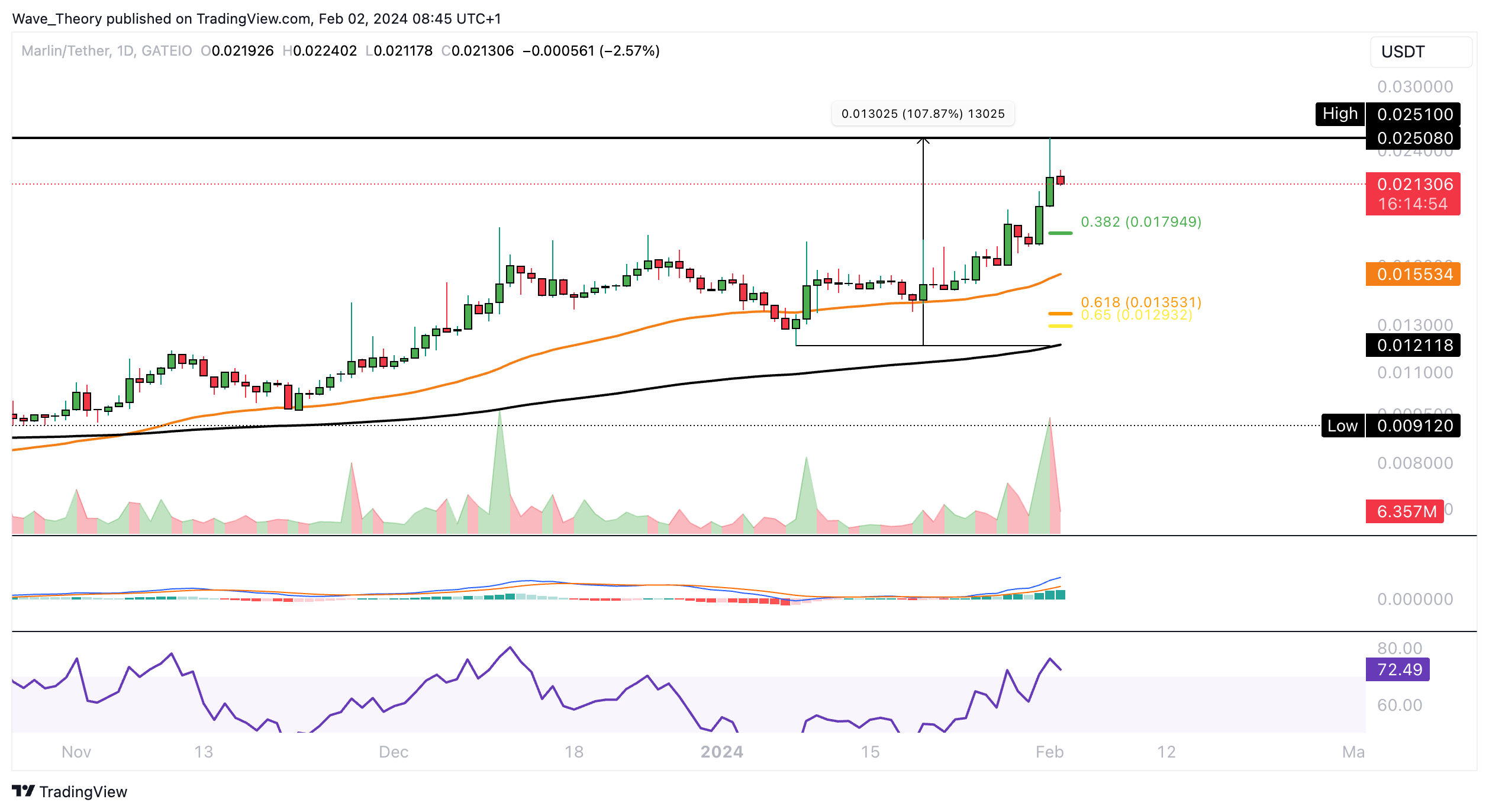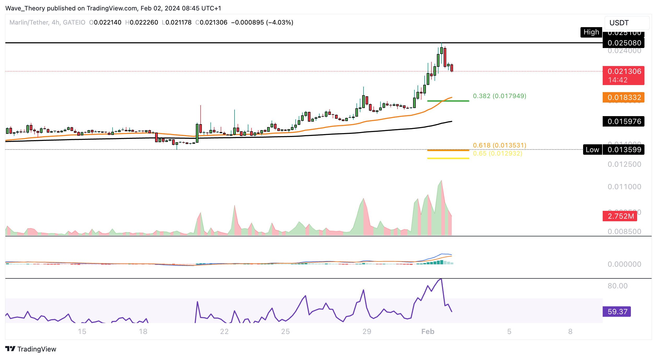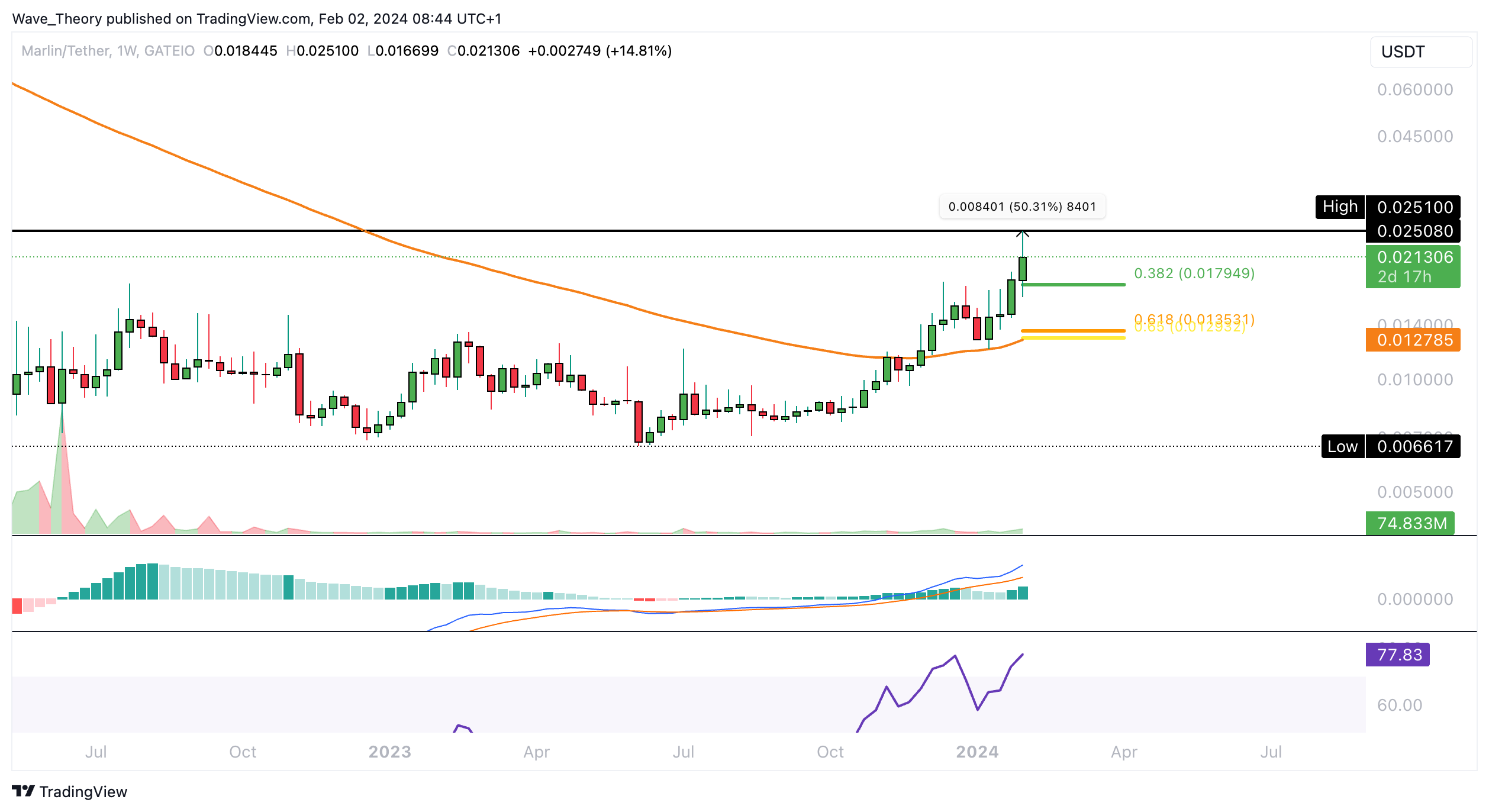 Alleine in dieser Woche konnte der Coin über 50 % im Kurs steigen. Doch am horizontalen Widerstand bei rund 0,025 USD scheint Marlin jetzt auf bärische Ablehnung zu stoßen.