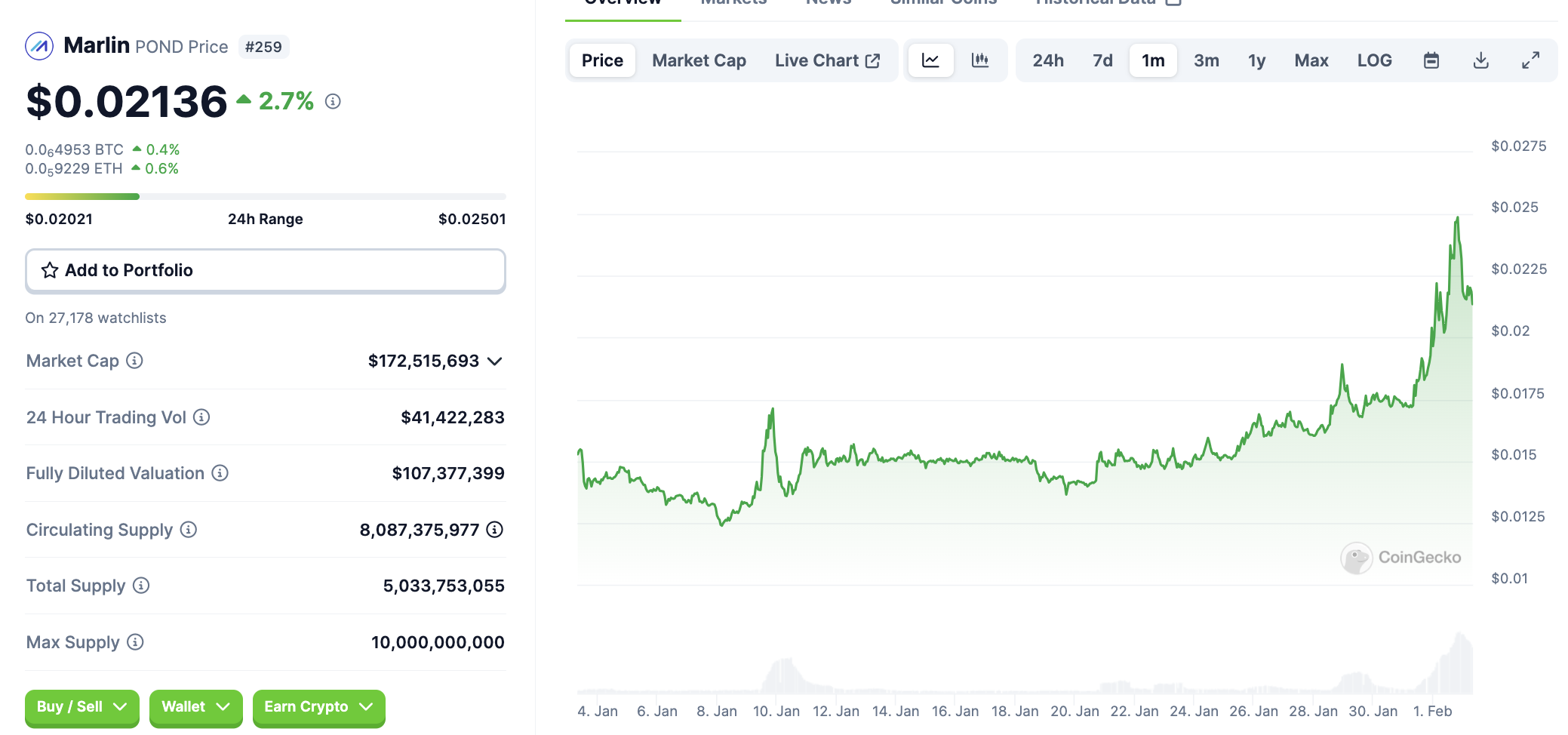Es handelt sich dabei um einen Coin, der bereits auf vielen Börsen gelistet ist. Der Coin Marlin (POND) weist derzeit eine Marktkapitalisierung von rund 173 Millionen USD auf.