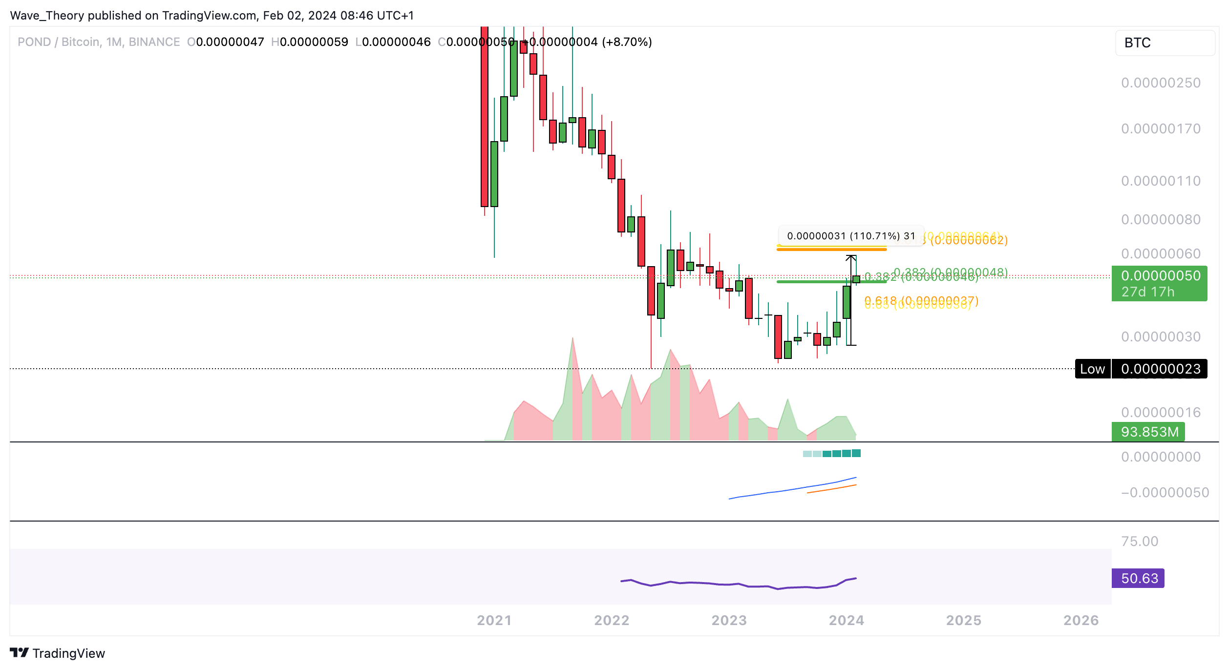 Wenn der POND Kurs jetzt korrigiert, warten bei rund 0,01795 USD und bei rund 0,0135 USD die nächsten signifikanten Fibonacci Unterstützungen. Bei rund 0,012785 USD fungiert der 50-Wochen-EMA als zusätzliche Unterstützung.