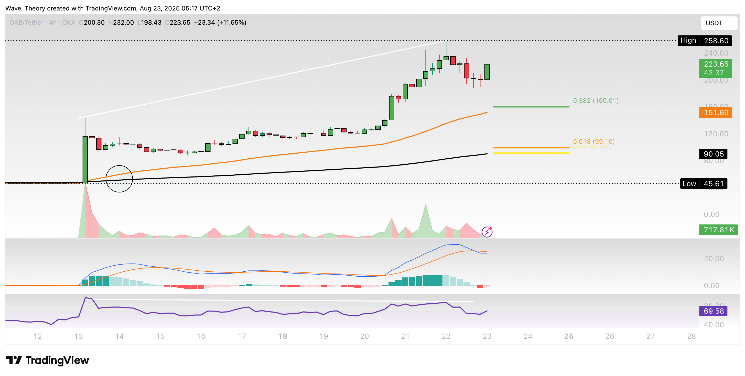 Der Coin OKB ist in diesem Monat rund 489 % gestiegen, nachdem er sich davor konsequent über dem 50-Monate-EMA bei rund 44 USD halten konnte.