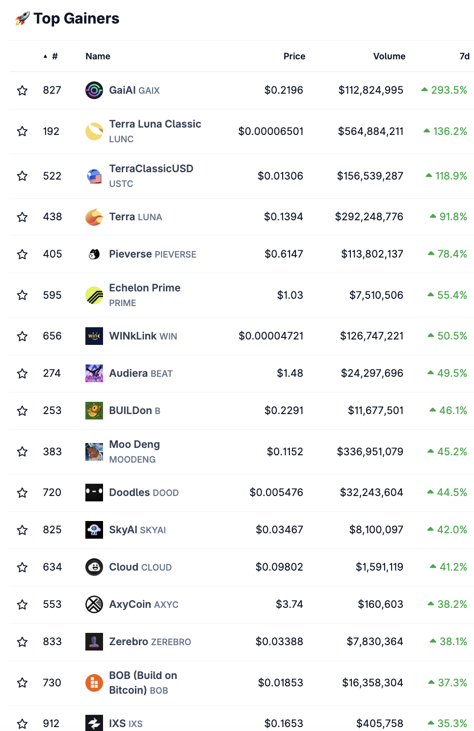 Der Coin GaiAI (GAIX) belegt in dieser Woche den ersten Platz der Top-Gewinner auf dem Krypto-Markt. Laut Coingecko ist er innerhalb der letzten sieben Tage rund 293,5 % im Kurs gestiegen.