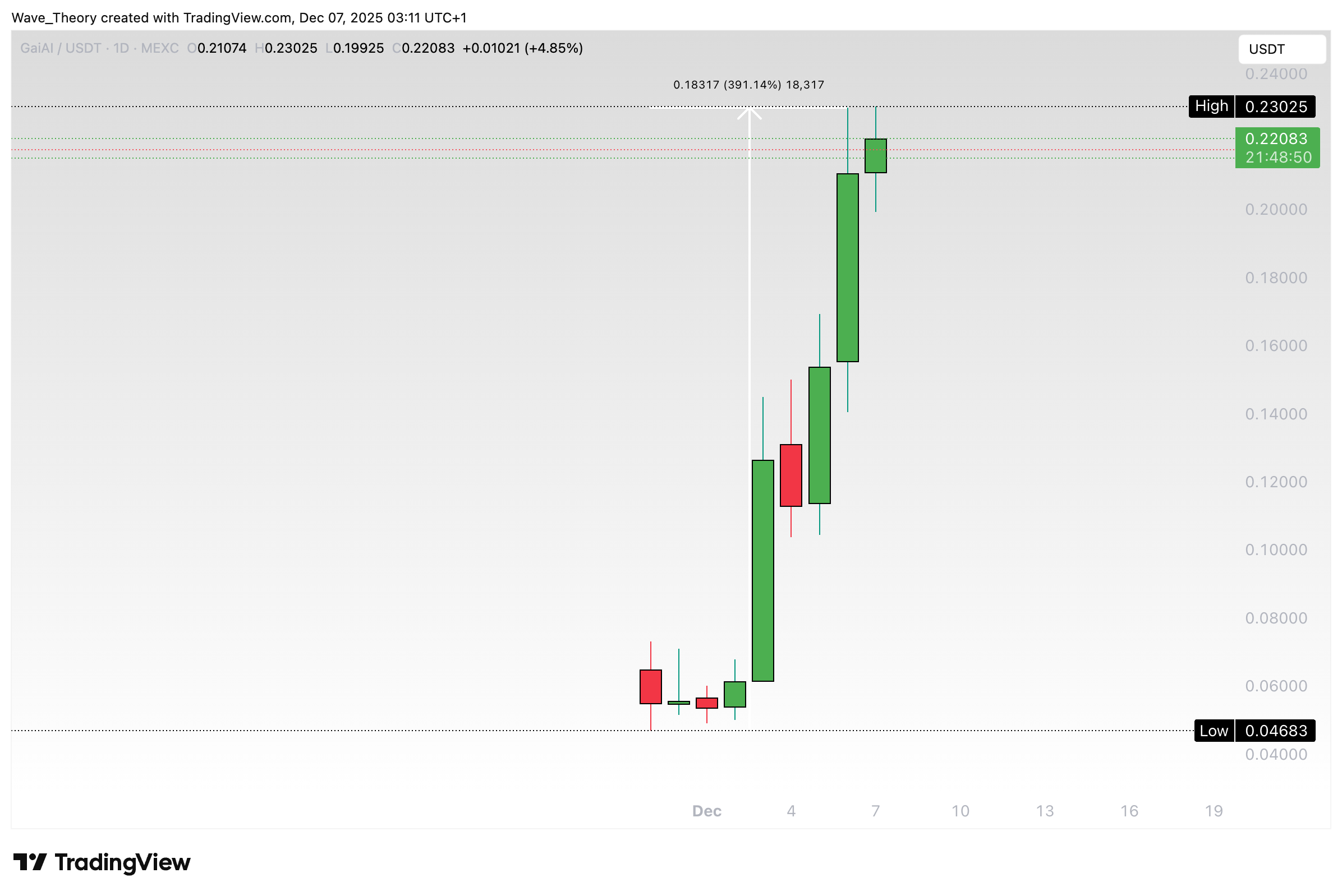 Der Coin ist seit Montag fast 400 % gestiegen und befindet sich derzeit auf rund 0,22 USD. Das ATH betrug dabei rund 0,23 USD.