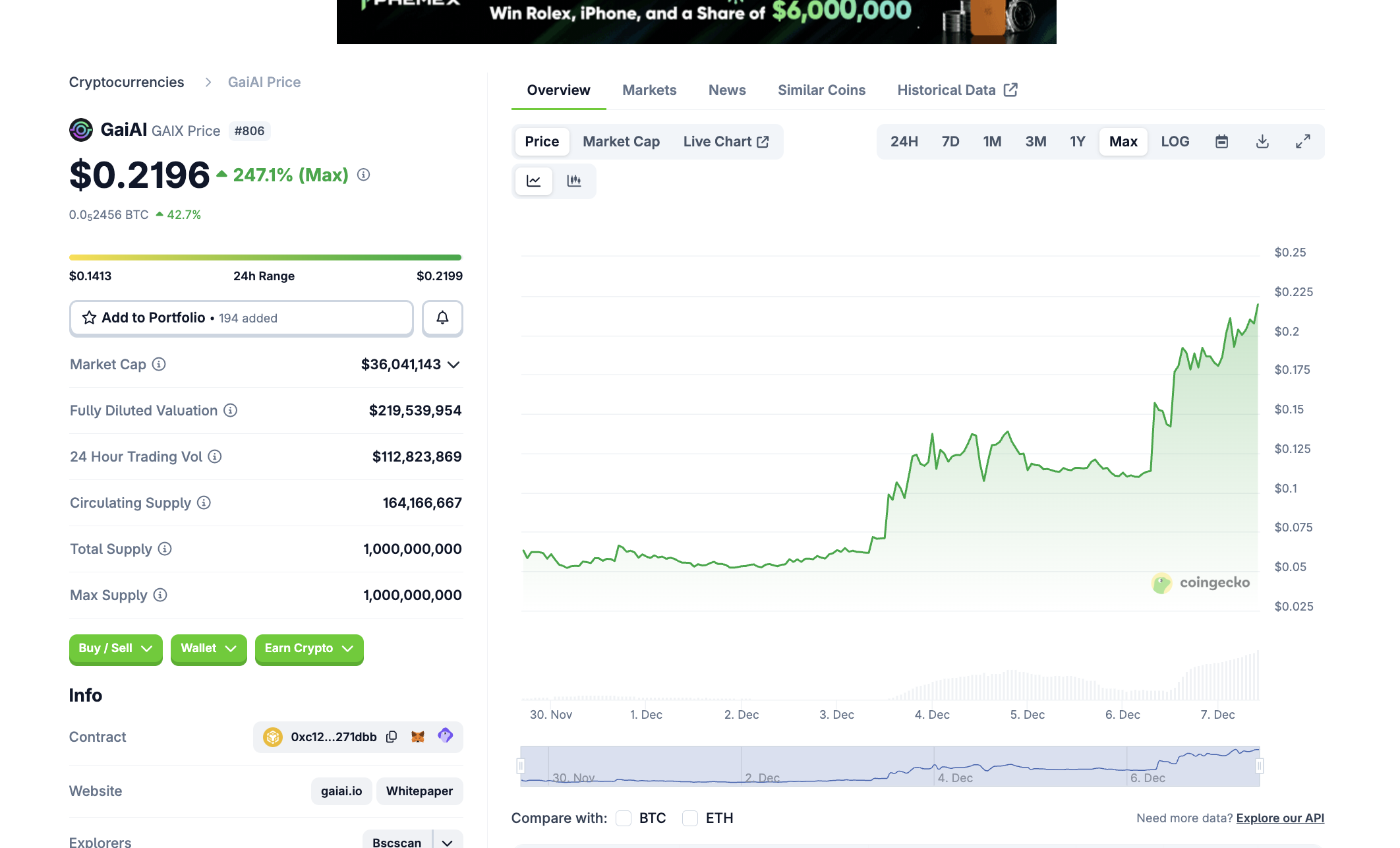 Mit einer Marktkapitalisierung von rund 36 Millionen USD befindet sich GaiAI (GAIX) auf Platz 806 im Coingecko Ranking. Damit ist der Coin noch winzig.