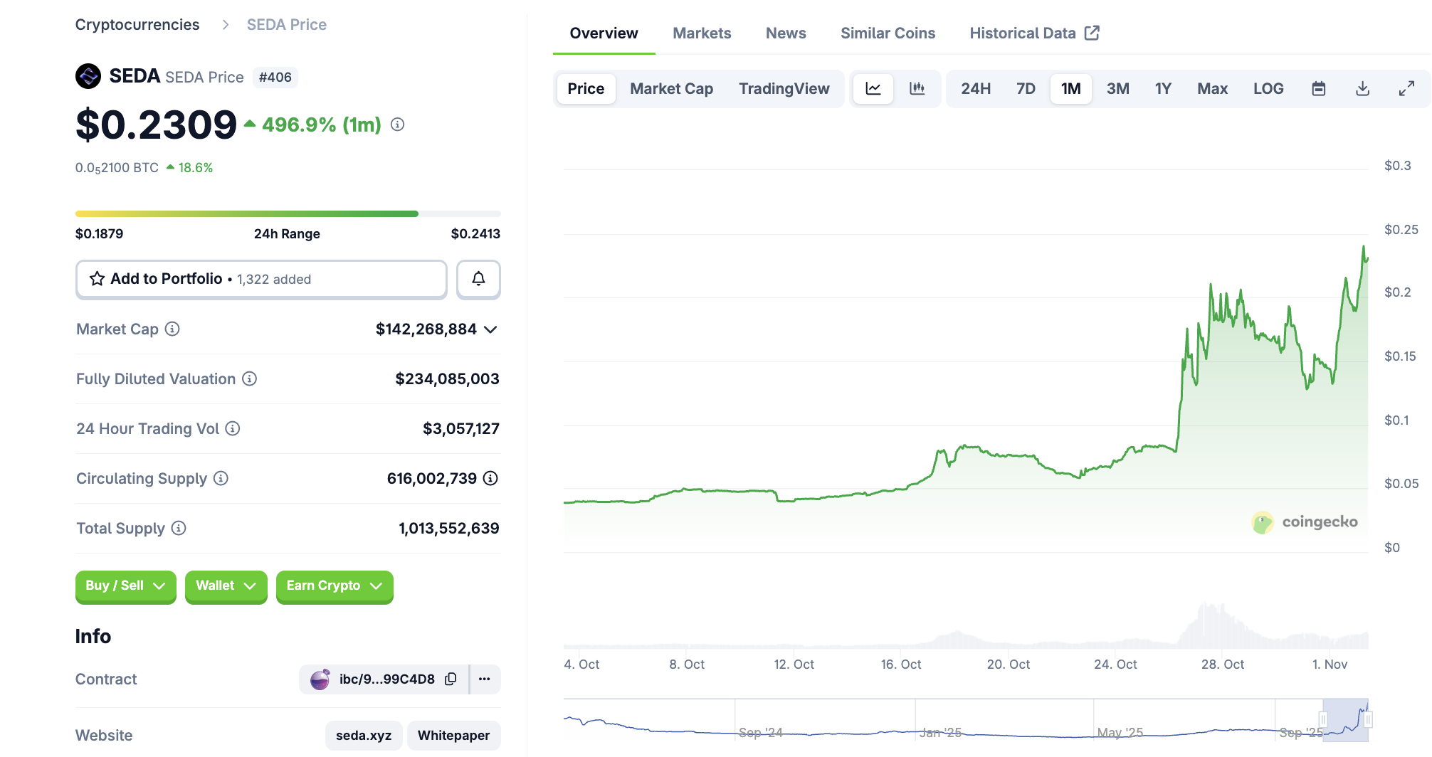 Mit einer Marktkapitalisierung von rund 142 Millionen USD befindet sich SEDA (SEDA) auf Platz 406 im Coingecko Ranking. Damit ist der Coin noch sehr klein.