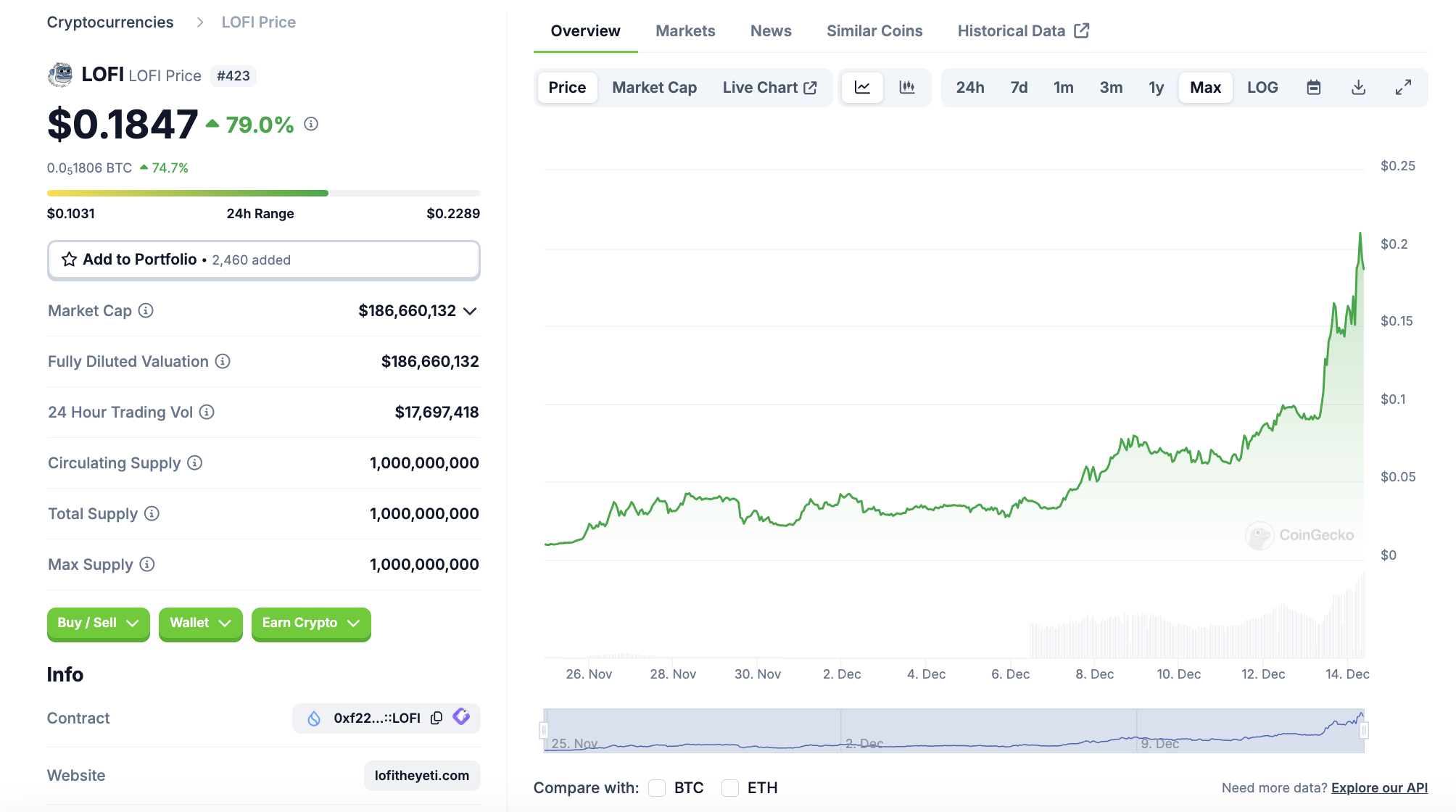 Mit einer Marktkapitalisierung von rund 187 Millionen USD befindet sich LOFI (LOFI) auf Platz 423 im Coingecko Ranking. Damit ist der Coin noch sehr klein.