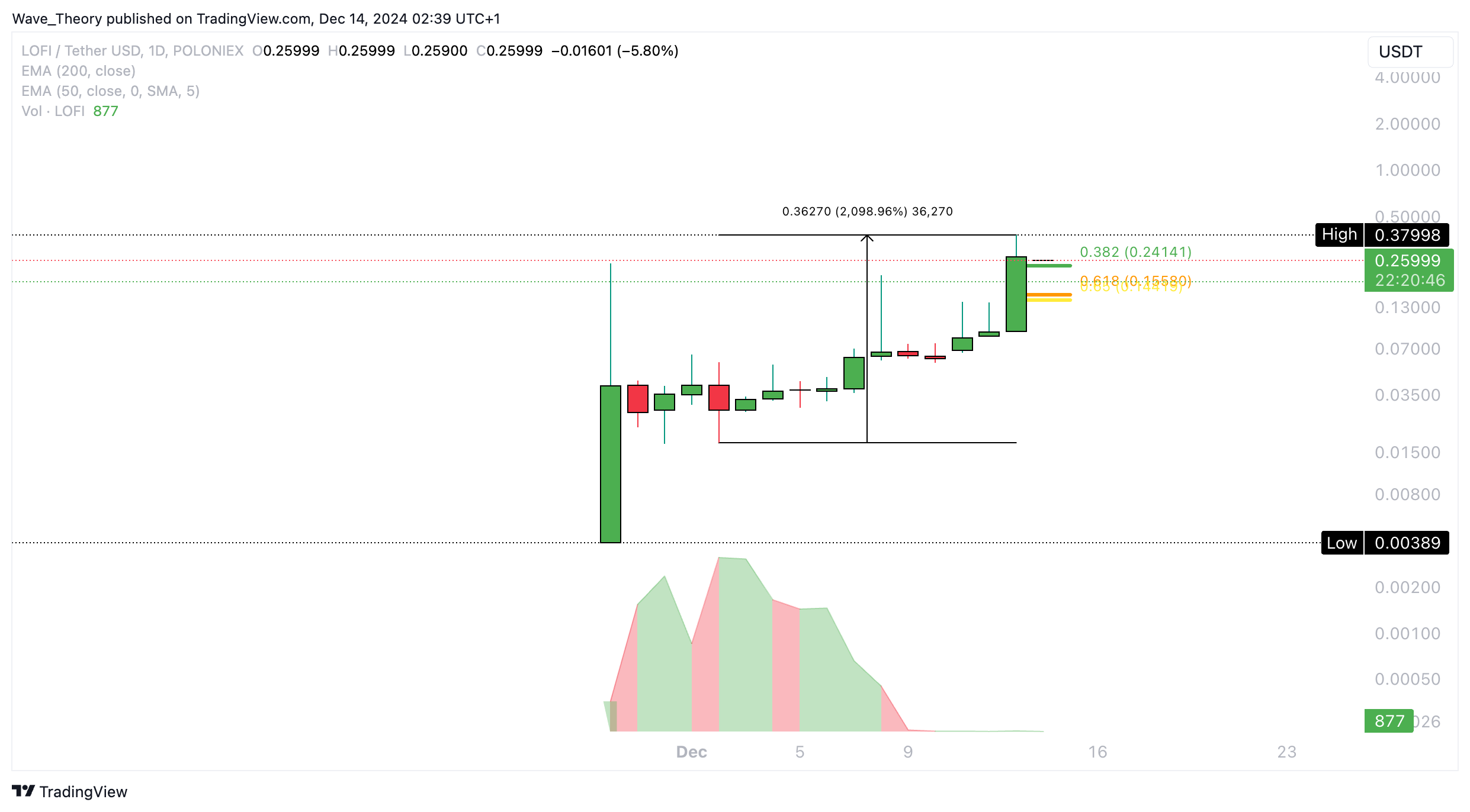 Wer in den Coin LOFI (LOFI) zum 02. Dezember 1.000 EUR gesteckt hat, saß zum Höhepunkt vorgestern auf rund 22.000 EUR.