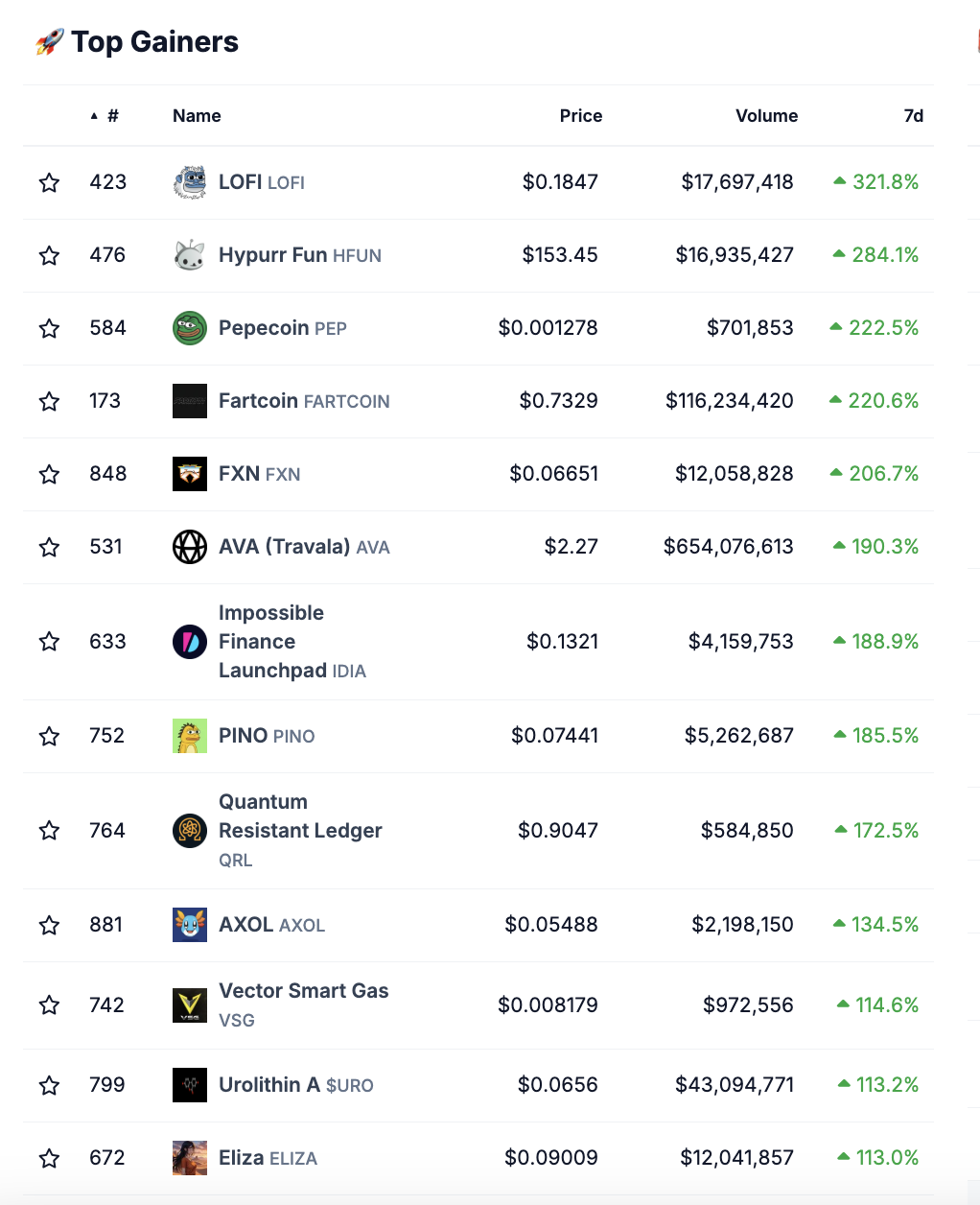 In den letzten sieben Tagen belegt LOFI den ersten Platz der stärksten Kursgewinne auf dem Krypto-Markt. Er weist dabei einen Kursanstieg von rund 322 % laut Coingecko auf.