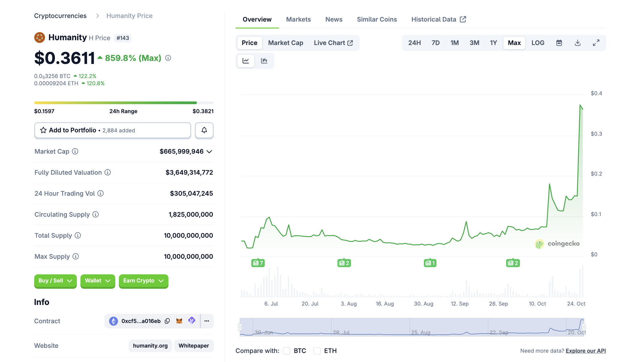 Mit einer Marktkapitalisierung von rund 666 Millionen USD befindet sich Humanity (H) auf Platz 143 im Coingecko Ranking. Damit ist der Coin noch verhältnismäßig klein.