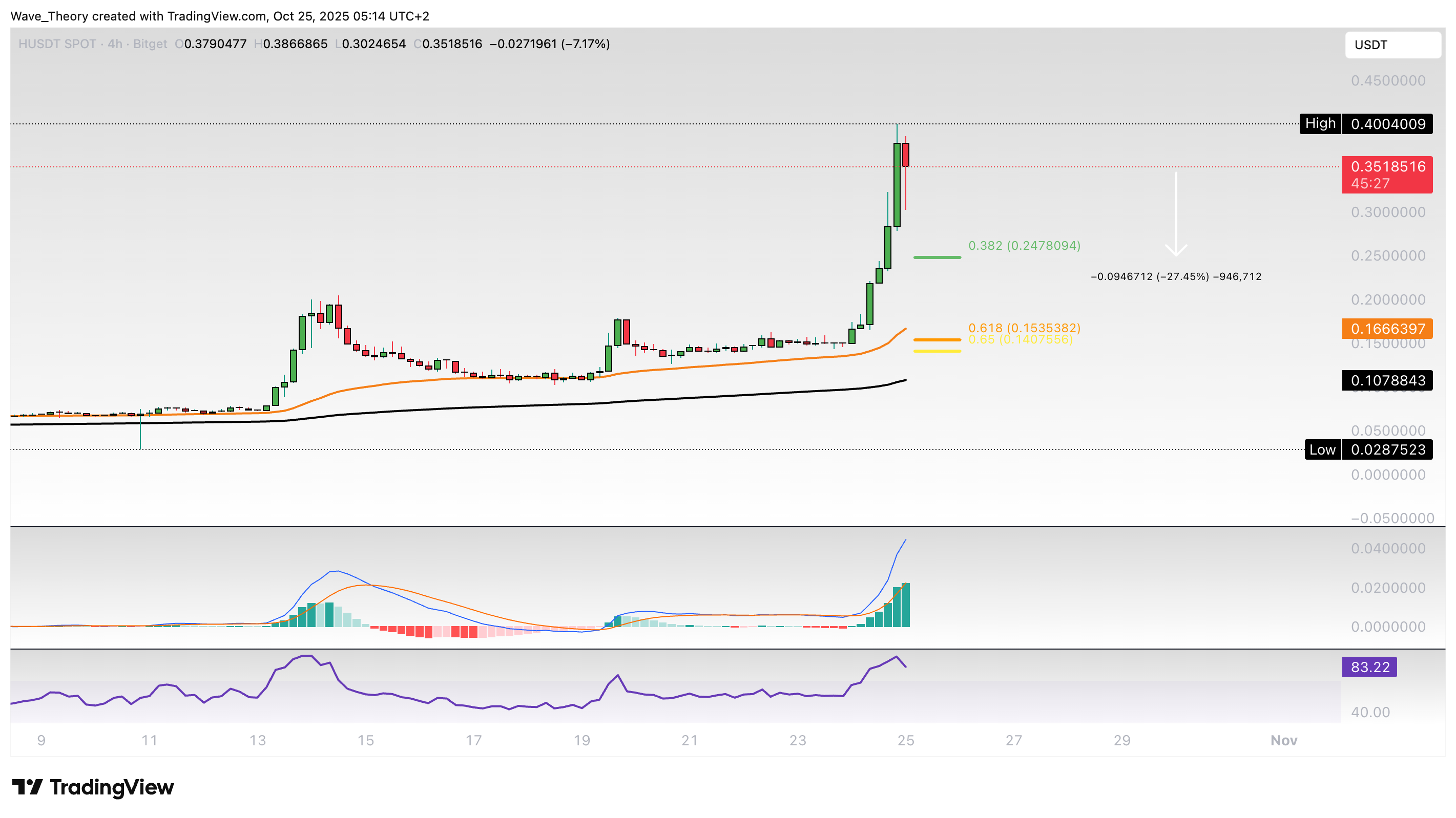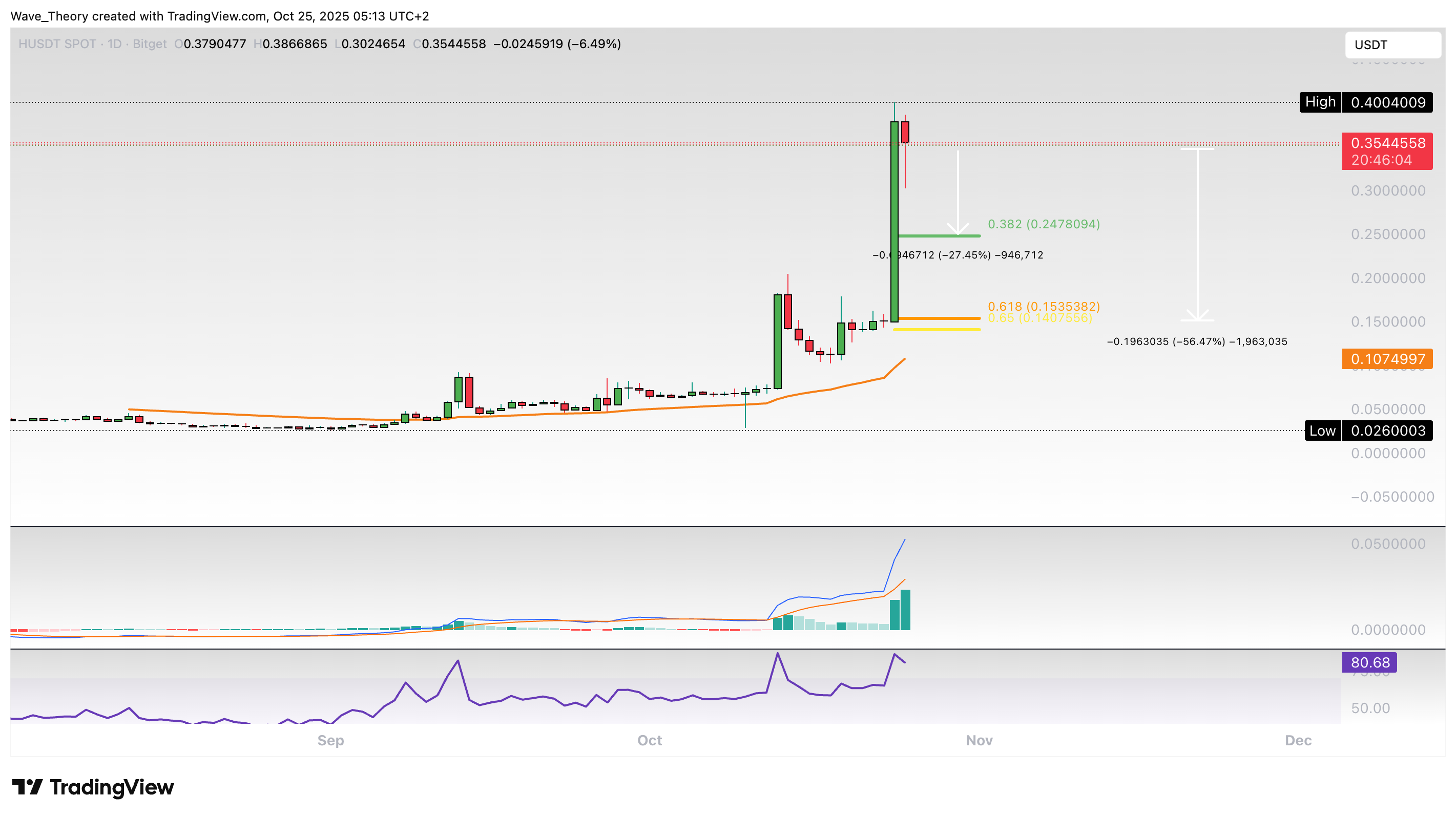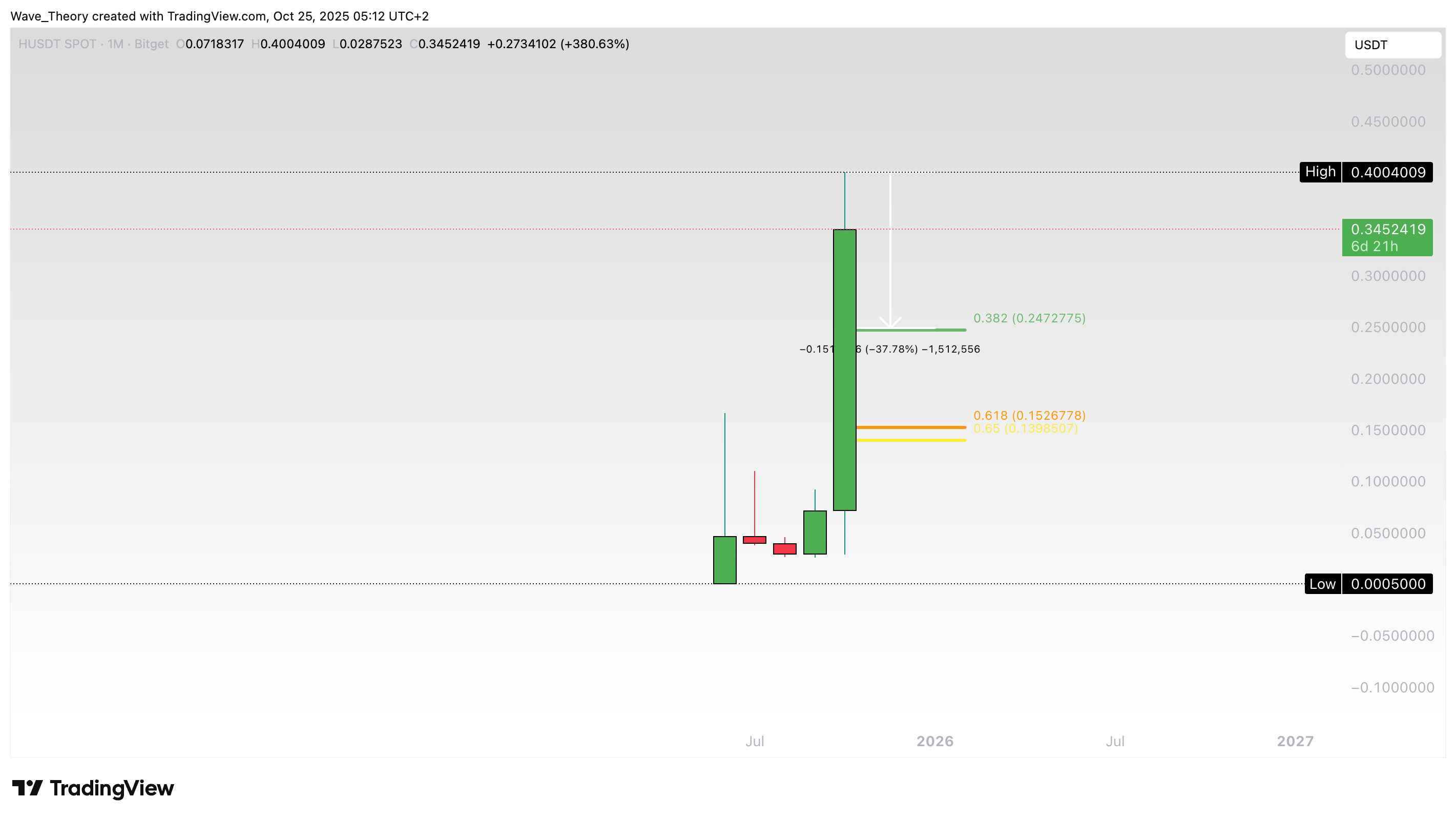 Nach einem Anstieg von rund 1.292 % in nur zwei Wochen könnte der Kurs jetzt eine Korrekturphase erleben. Damit könnte der Humanity (H) Coin zur 0,382 Fib Unterstützung bei rund 0,247 USD korrigieren.