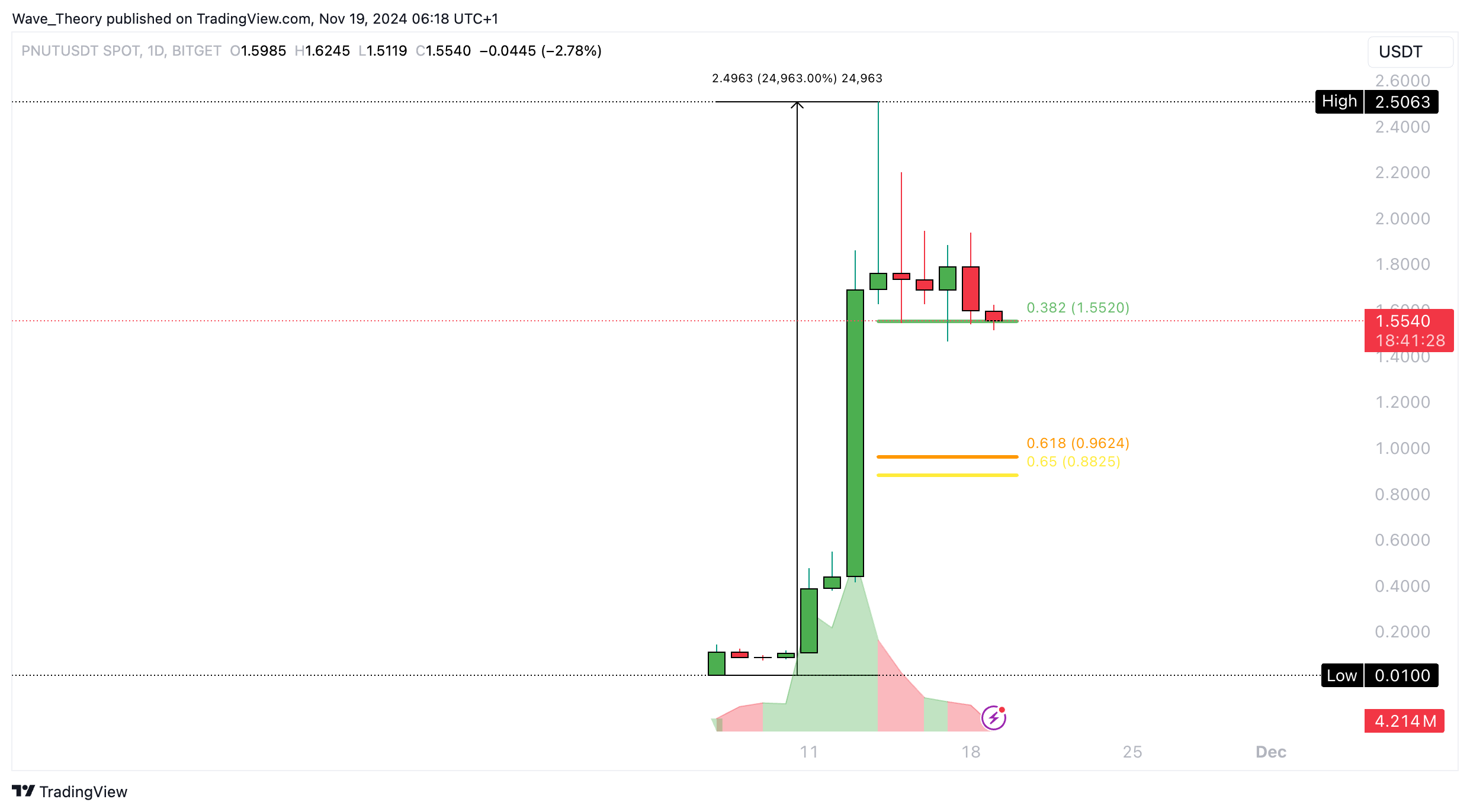 PNUT ist vom 07. November zum 14. November fast 25.000 % im Kurs gestiegen. Doch seit fünf Tagen befindet sich PNUT in einer Korrekturbewegung.