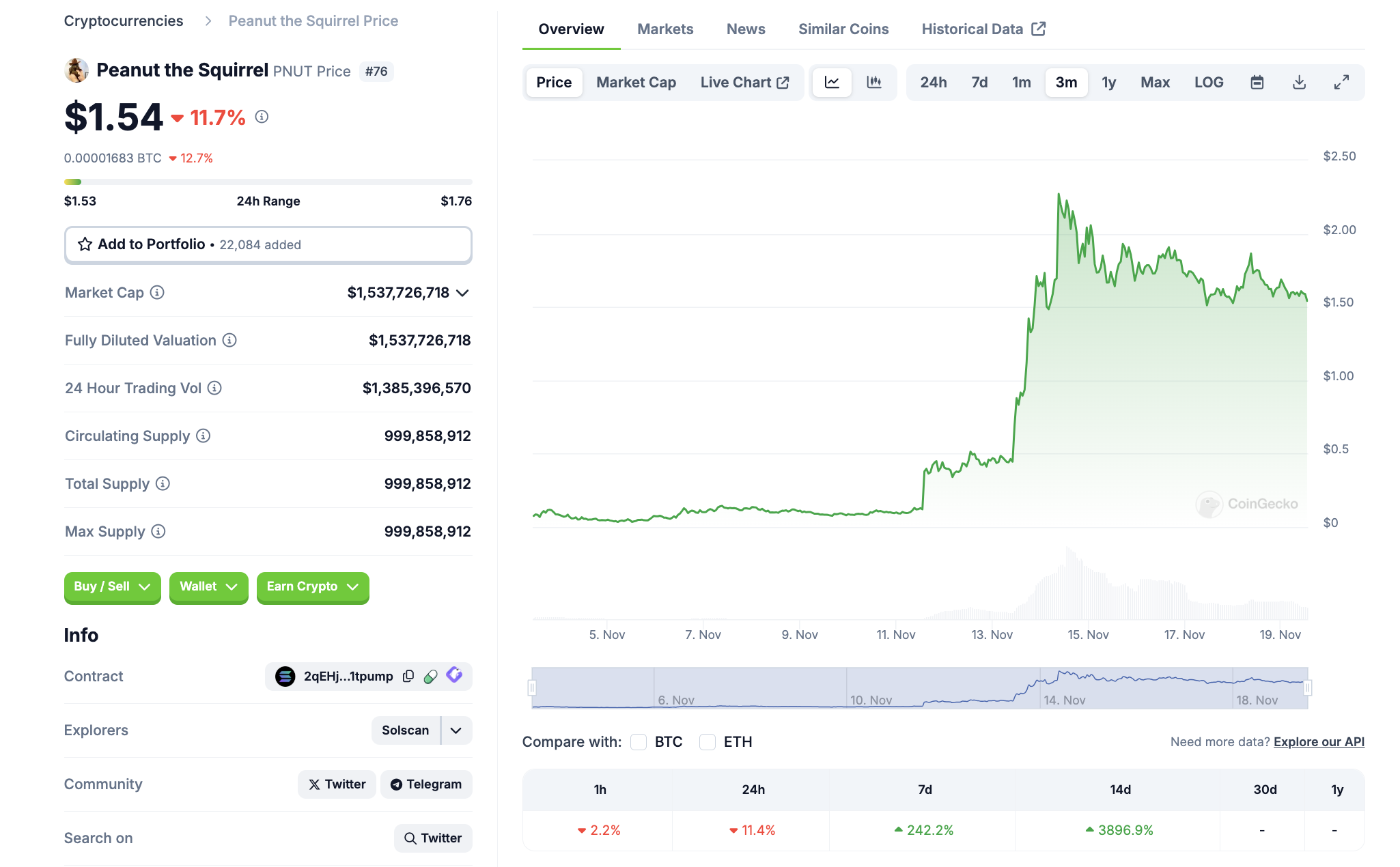 Mit einer Marktkapitalisierung von rund 1,54 Billionen USD befindet sich Peanut the Squirrel (PNUT) auf Platz 76 im Coingecko Ranking. Damit ist der Coin bereits sehr groß und.