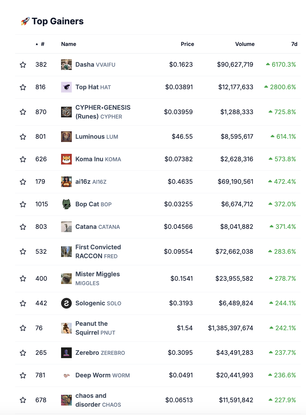 In den letzten sieben Tagen belegt Peanut the Squirrel 12. Platz der stärksten Kursgewinne auf dem Krypto-Markt. Dabei weist der Coin aber mit Abstand das höchste Handelsvolumen auf.