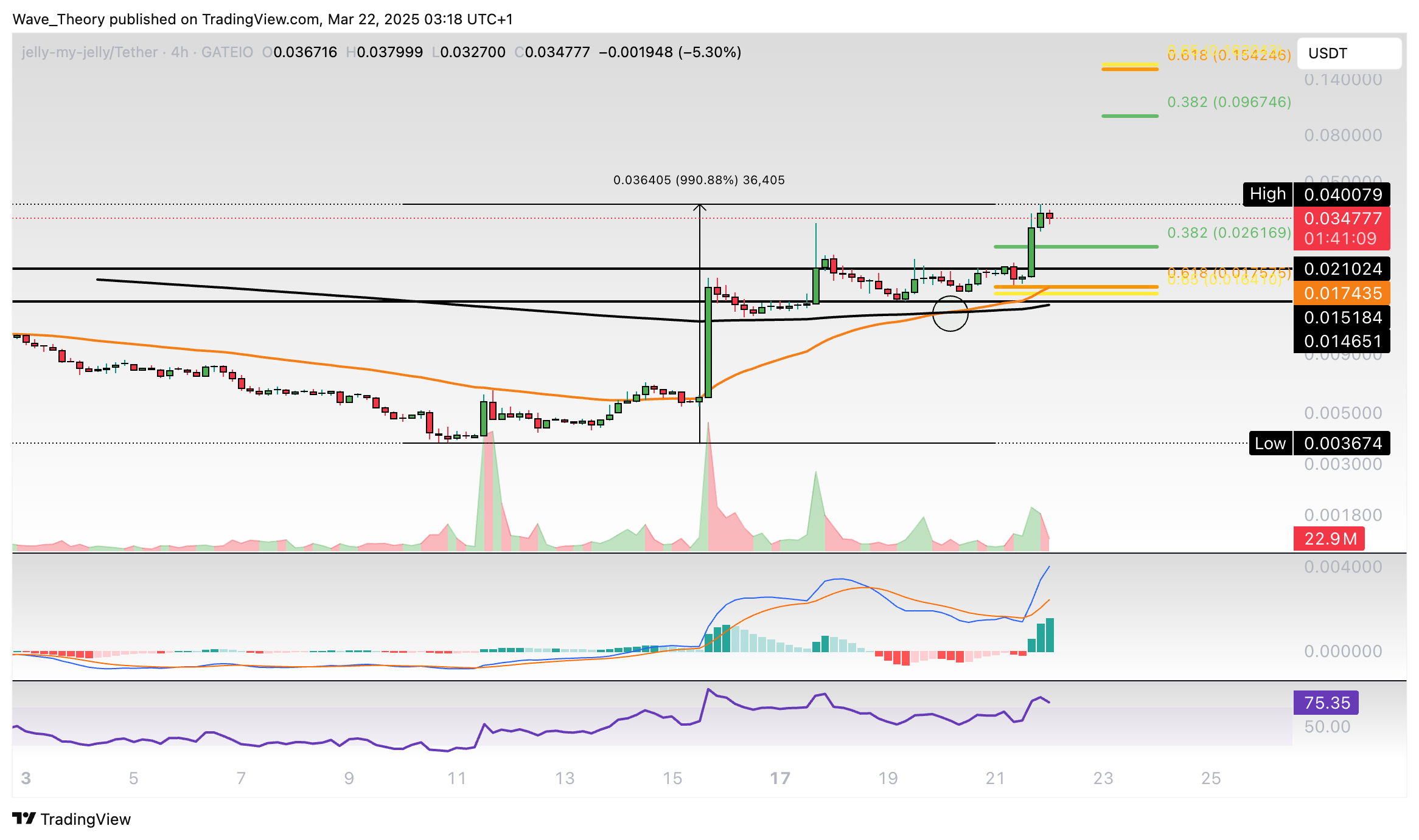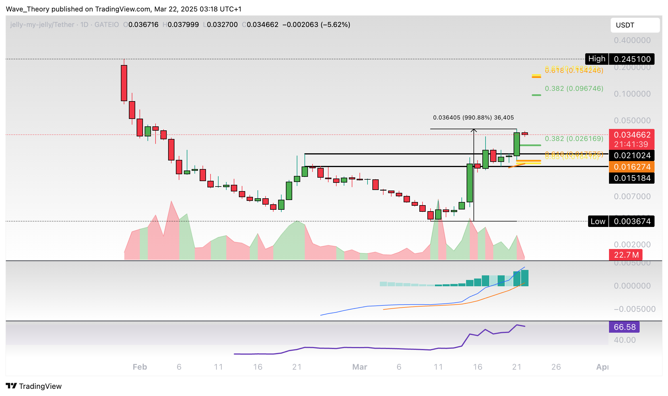 Jelly-My-Jelly (JELLYJELLY) ist seit letzter Woche Montag rund 991 % im Kurs gestiegen. Dabei hat er die entscheidenden Fibonacci Widerstände bei rund 0,097 USD und 0,155 USD noch nicht erreicht.