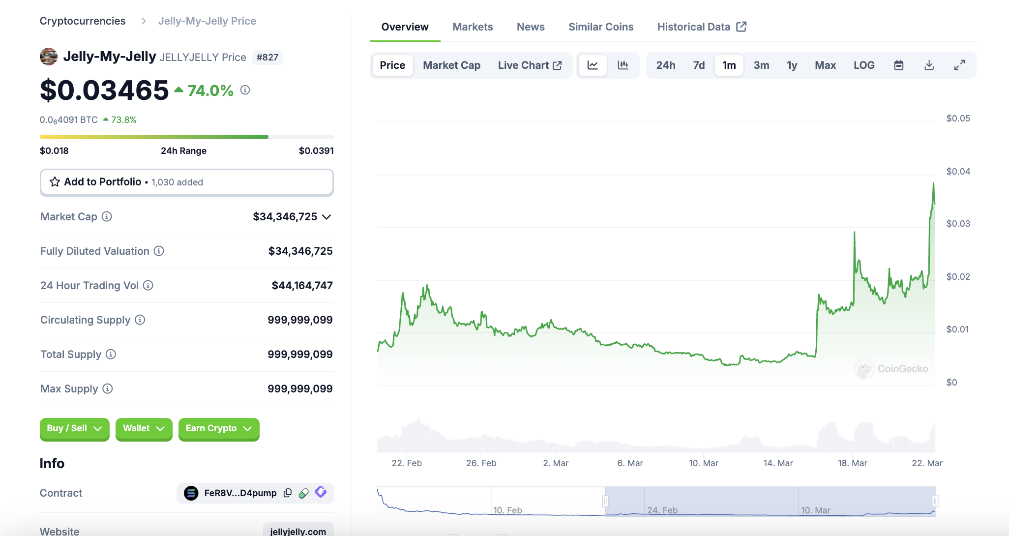 Mit einer Marktkapitalisierung von rund 34 Millionen USD befindet sich Jelly-My-Jelly (JELLYJELLY) auf Platz 827 im Coingecko Ranking. Damit ist der Coin noch sehr klein.