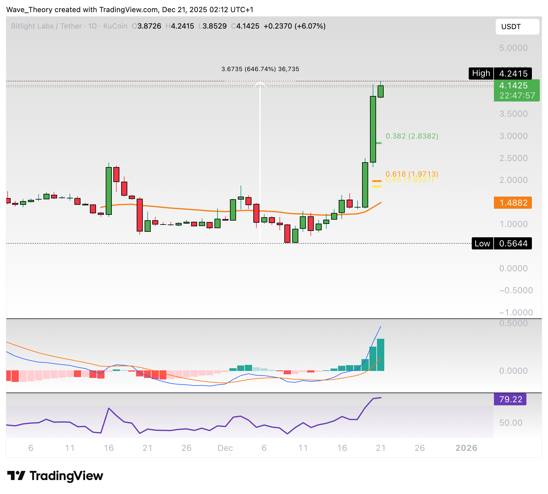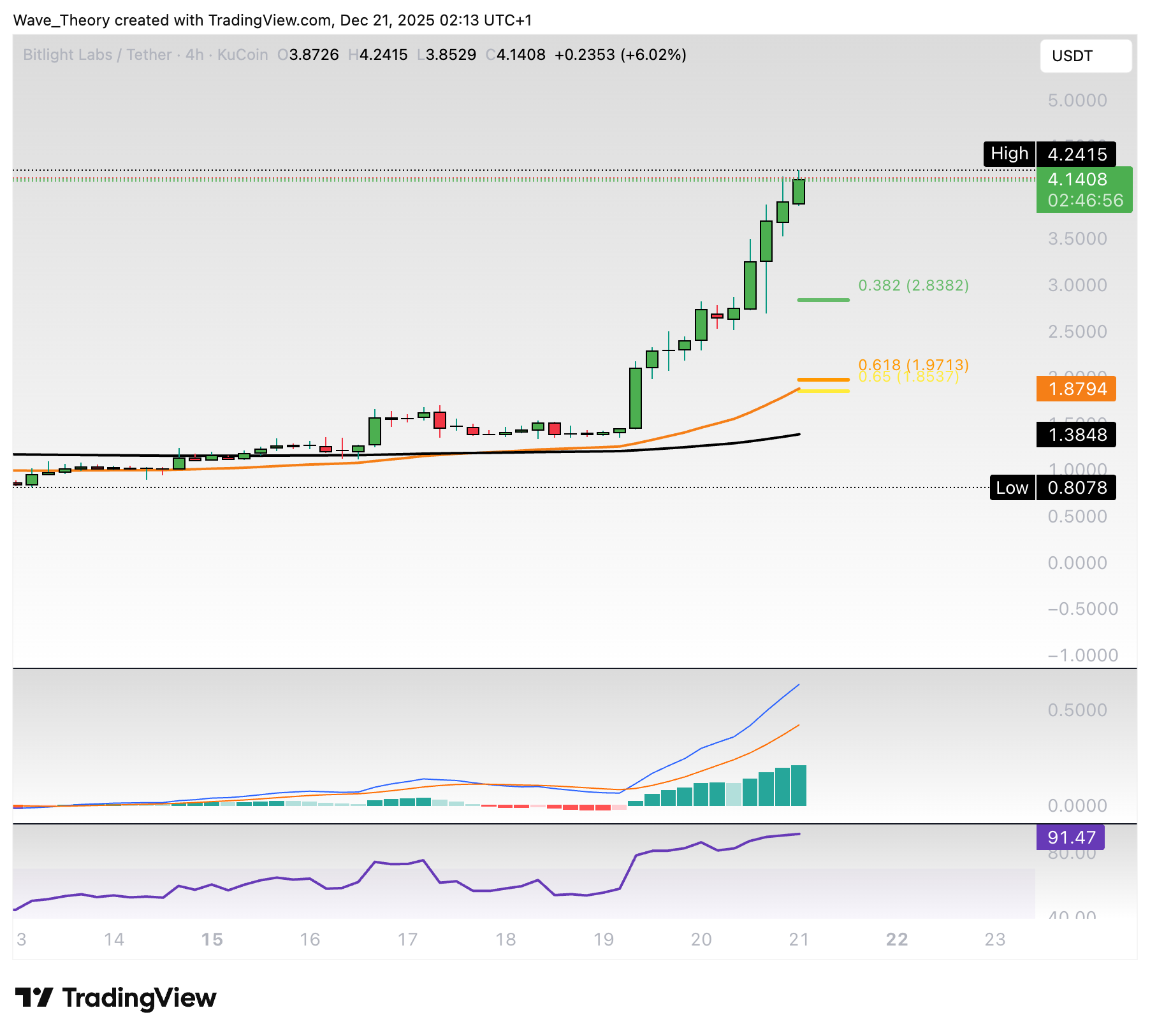 Insgesamt sieht es bullisch für den Bitlight (LIGHT) Kurs aus. Sollte er aber die Golden Ratio Unterstützung bei rund 1,95 USD bärisch brechen, ist die Aufwärtsbewegung bärisch invalidiert.
