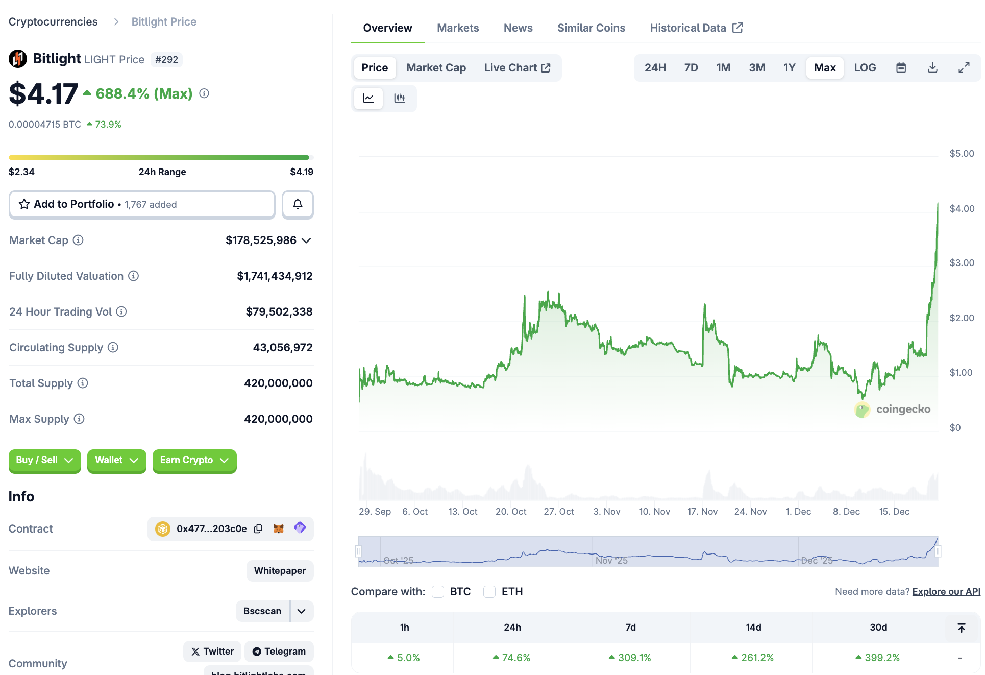 Mit einer Marktkapitalisierung von rund 180 Millionen USD befindet sich Bitlight (LIGHT) auf Platz 292 im Coingecko Ranking. Damit ist der Coin noch sehr klein.
