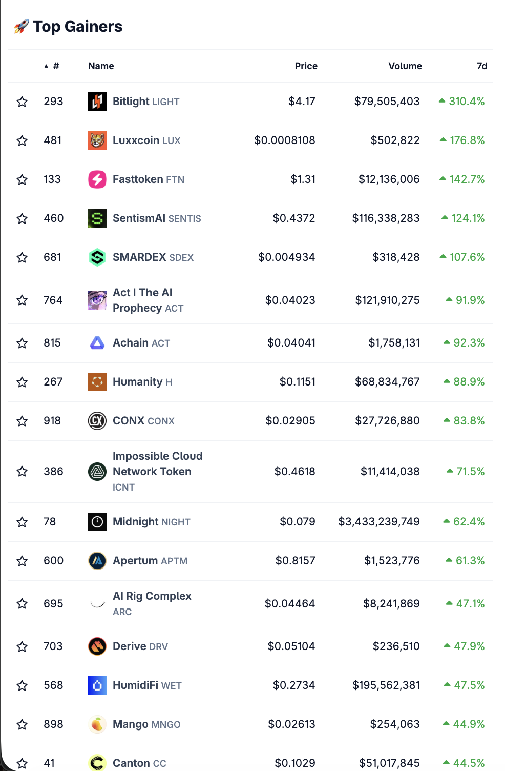 Der Coin Bitlight (LIGHT) belegt in dieser Woche den ersten Platz der Top-Gewinner auf dem Krypto-Markt. Laut Coingecko ist er innerhalb der letzten sieben Tage rund 310 % im Kurs gestiegen. Dabei weist er ein beachtliches Handelsvolumen von rund 80 Millionen USD auf.