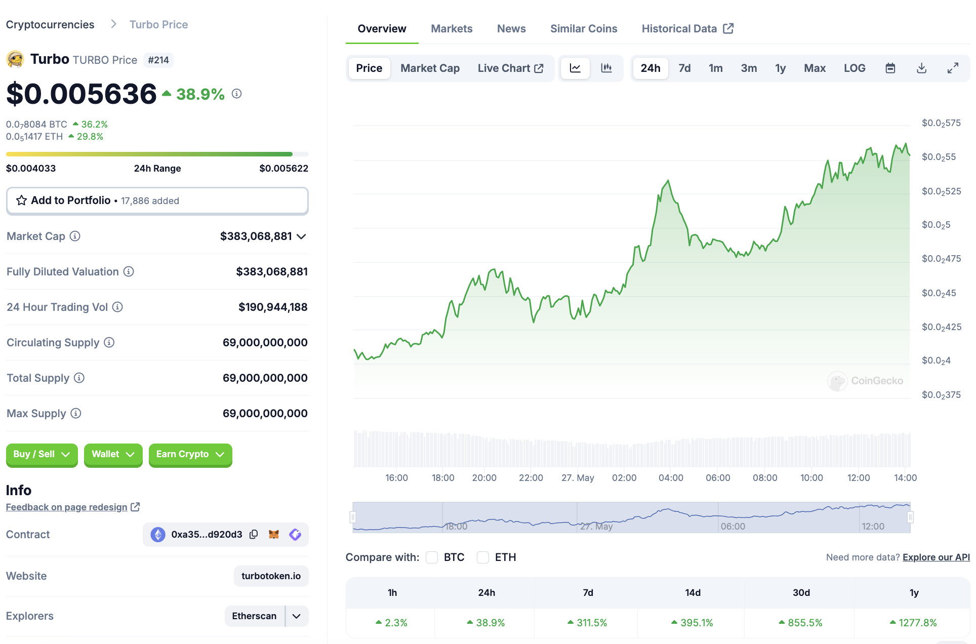 Der Coin Turbo (TURBO) weist derzeit eine Marktkapitalisierung von rund 383 Millionen USD auf. Damit befindet sich der Coin erst auf Platz 214 im Marktkapitalisierungsranking von Goingecko. Es besteht also noch viel Wachstumspotenzial.