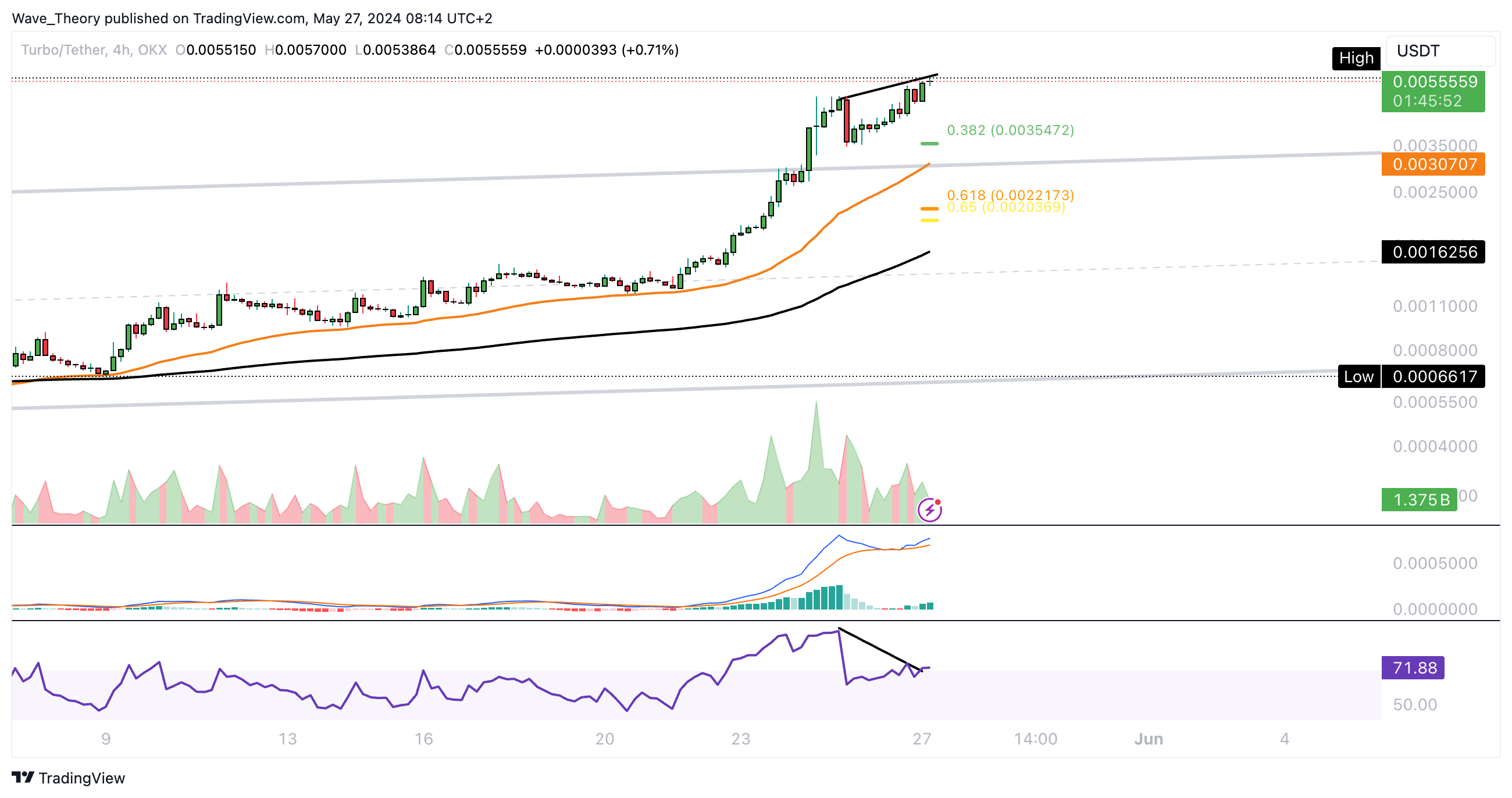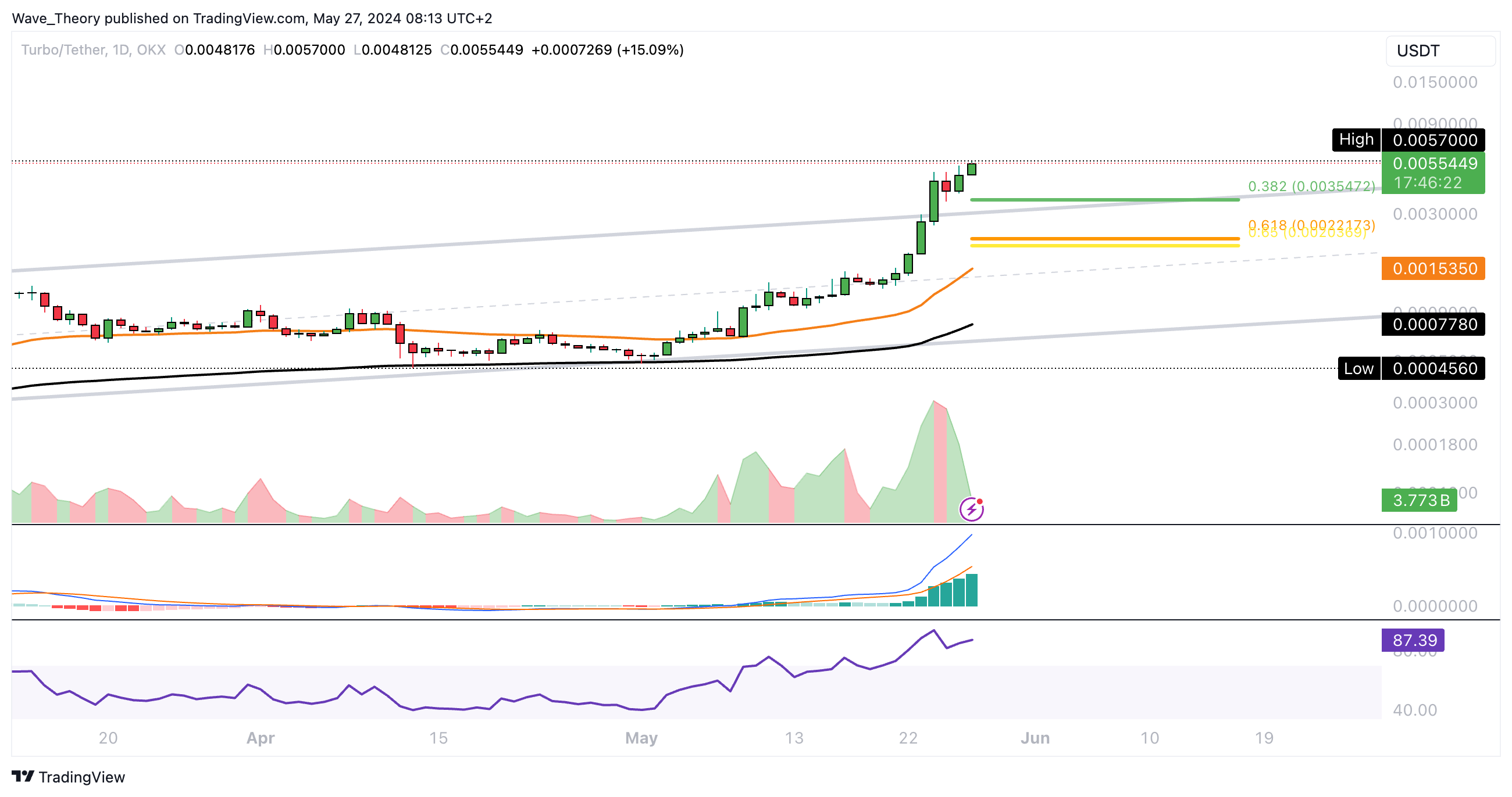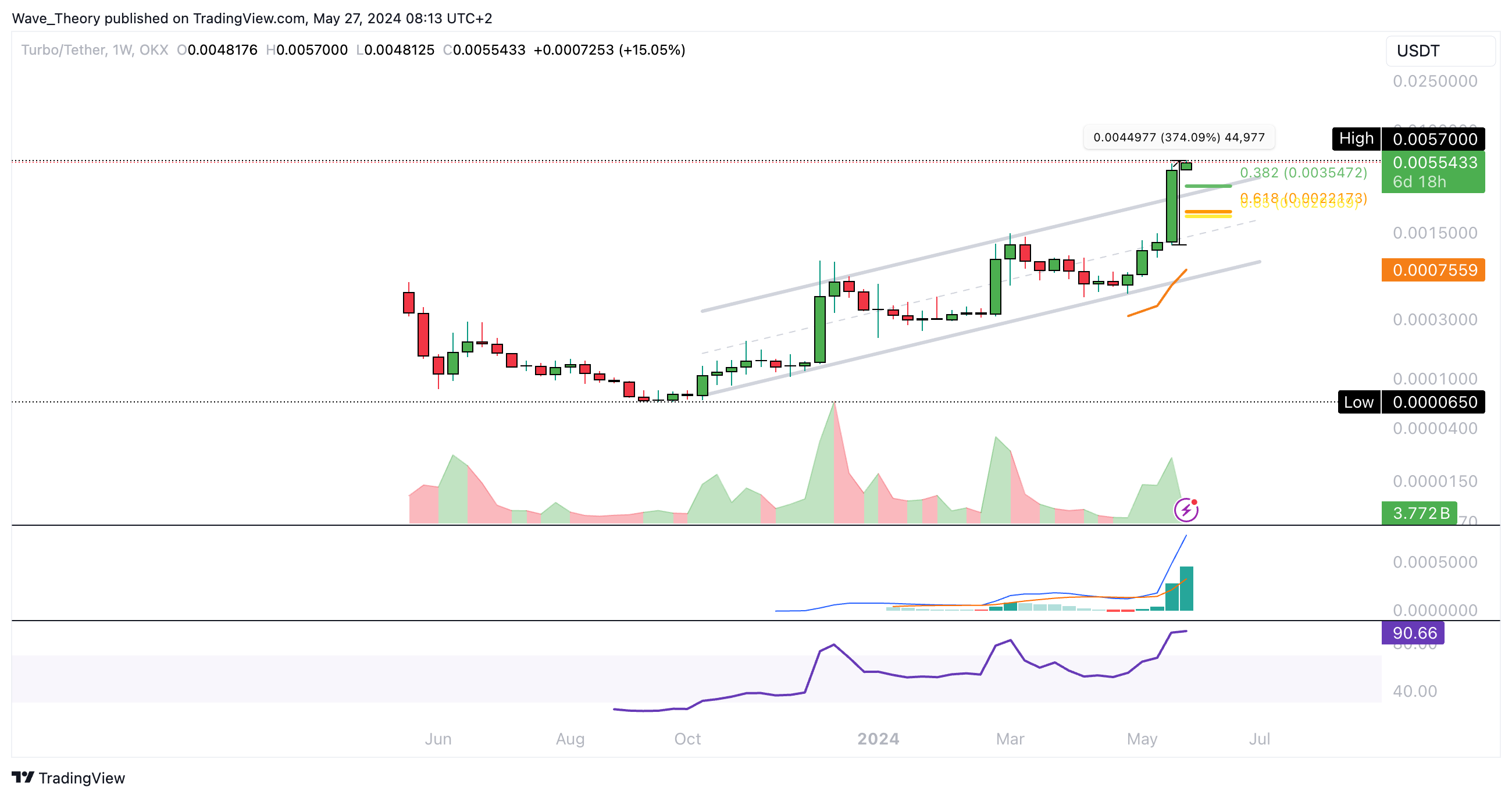 Sollte Turbo jetzt dennoch unerwartet korrigieren, warten bei rund 0,00355 USD und bei rund 0,0022 USD die nächsten signifikanten Fibonacci Unterstützungen.