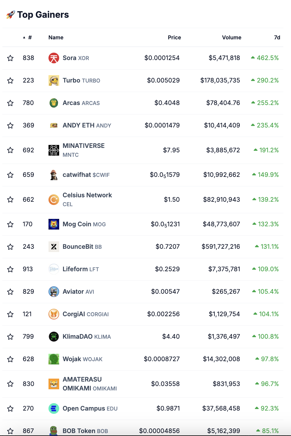 Unter den Top Kursgewinnen auf dem Krypto-Markt belegt Turbo (TURBO) mit einem Anstieg von 290 % in den letzten sieben Tagen und einem Handelsvolumen von fast 178 Millionen USD den zweiten Platz.