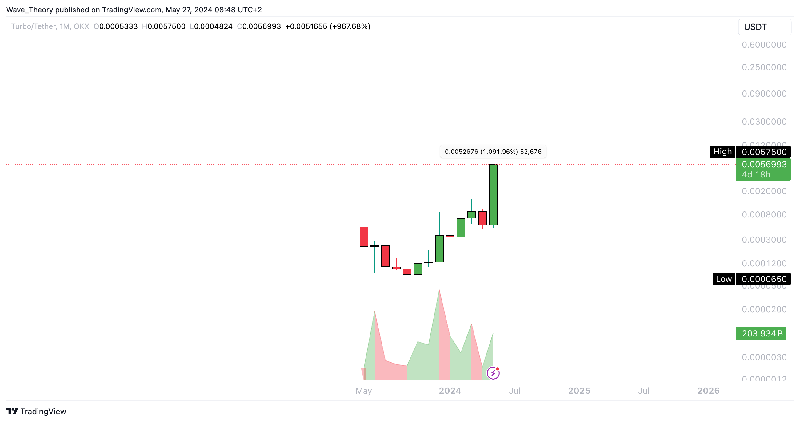 Der Kurs von TURBO hat seit Beginn des Monats einen Anstieg von rund 1.092 % verzeichnet. Insgesamt befindet sich der Coin seit acht Monaten in einem Aufwärtstrend.