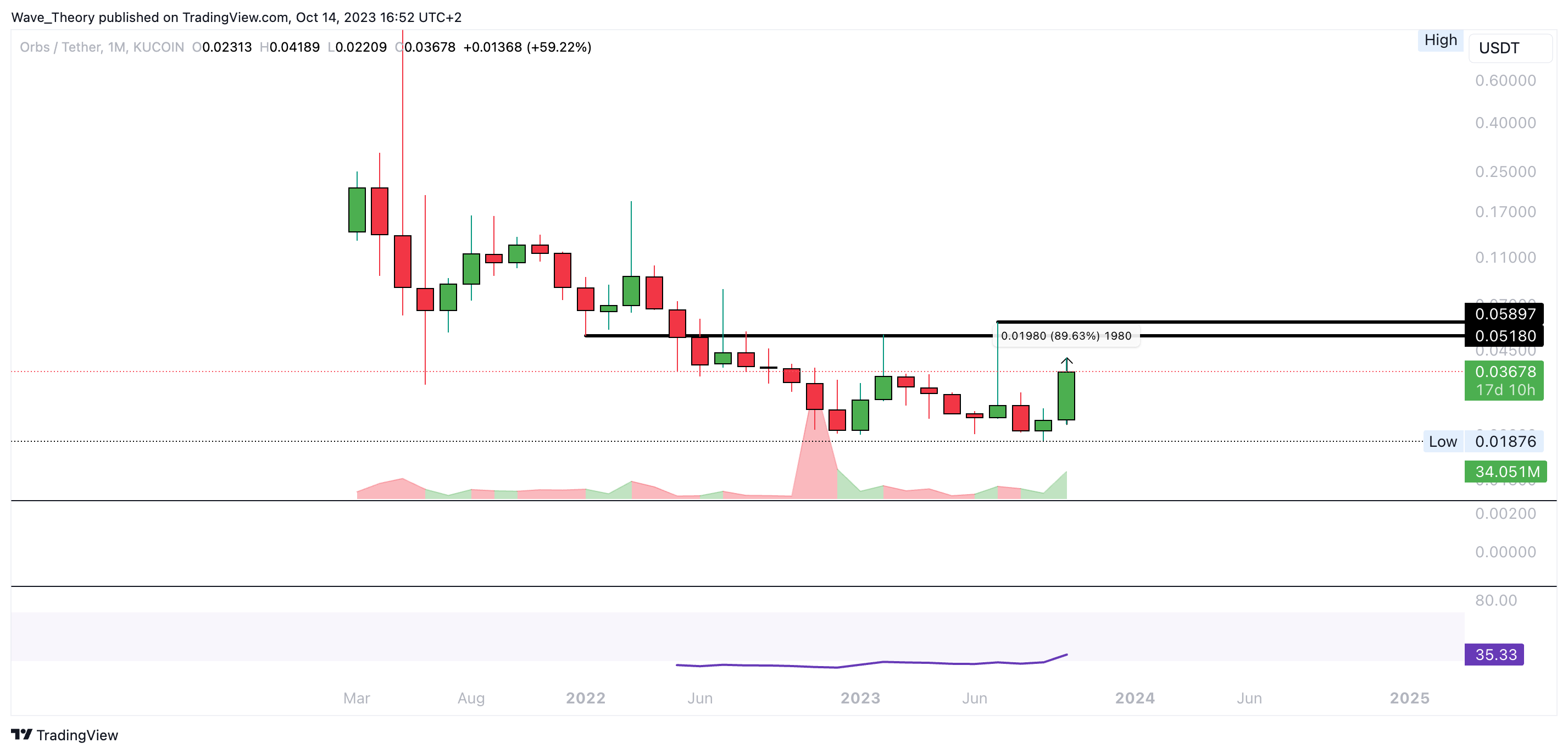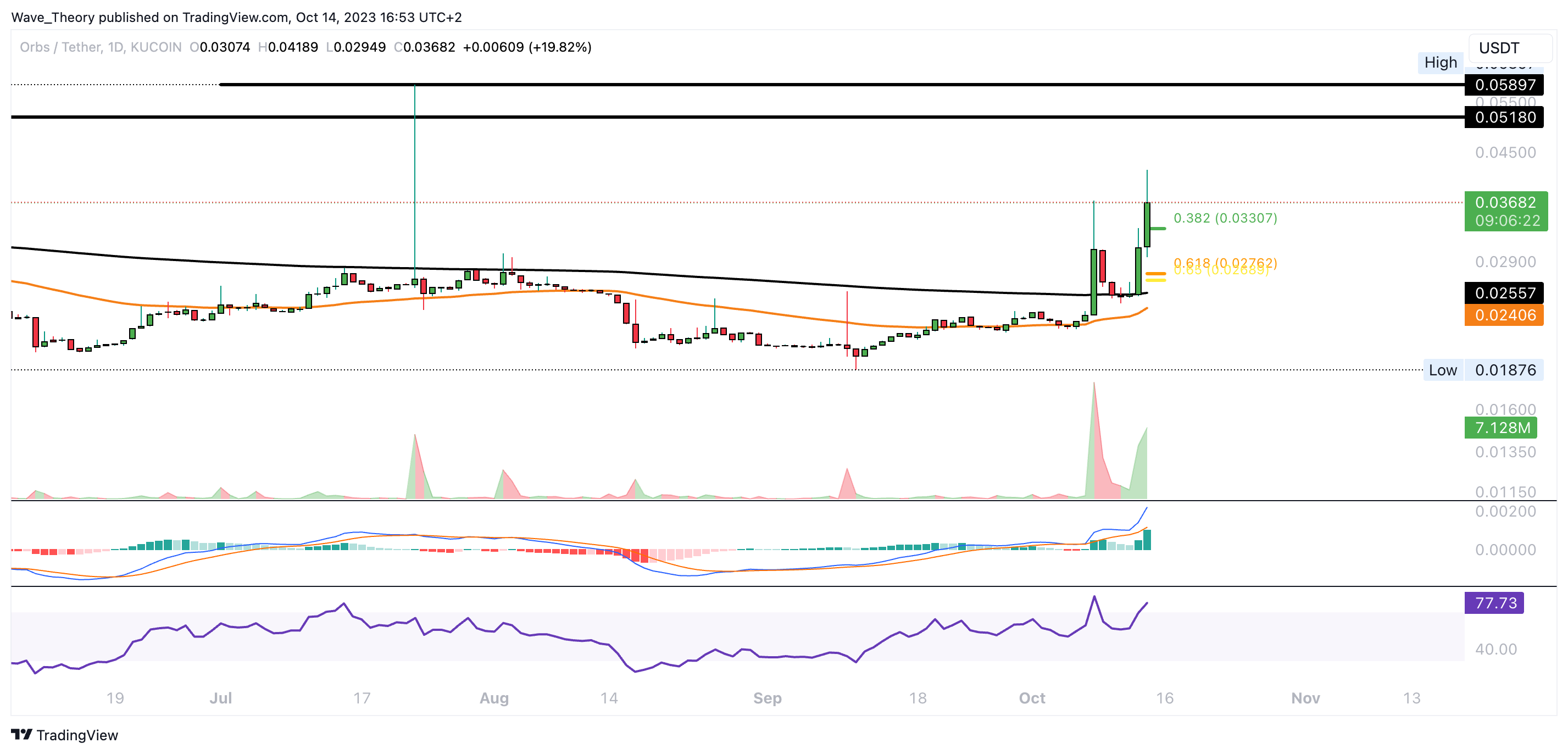 Den 50-Wochen-EMA Widerstand bei rund 0,03 USD konnte der ORBS Kurs bereits überwinden. Damit tickt auch das Histogramm des MACDs seit einigen Wochen bullisch höher und die MACD Linien sind bullisch überkreuzt.