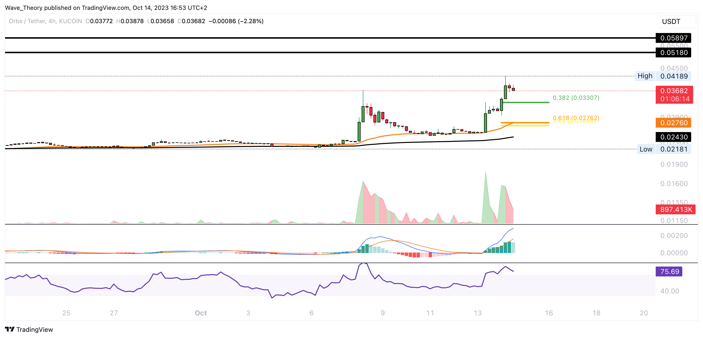 Damit könnte der Orbs Kurs jetzt eine Korrektur einleiten. Bei rund 0,03 USD und 0,0275 USD stößt der Coin auf die nächsten signifikanten Fibonacci Unterstützungen. An der Golden Ratio bei rund 0,0275 USD fungiert zudem der 50-4H-EMA als zusätzliche Unterstützung.