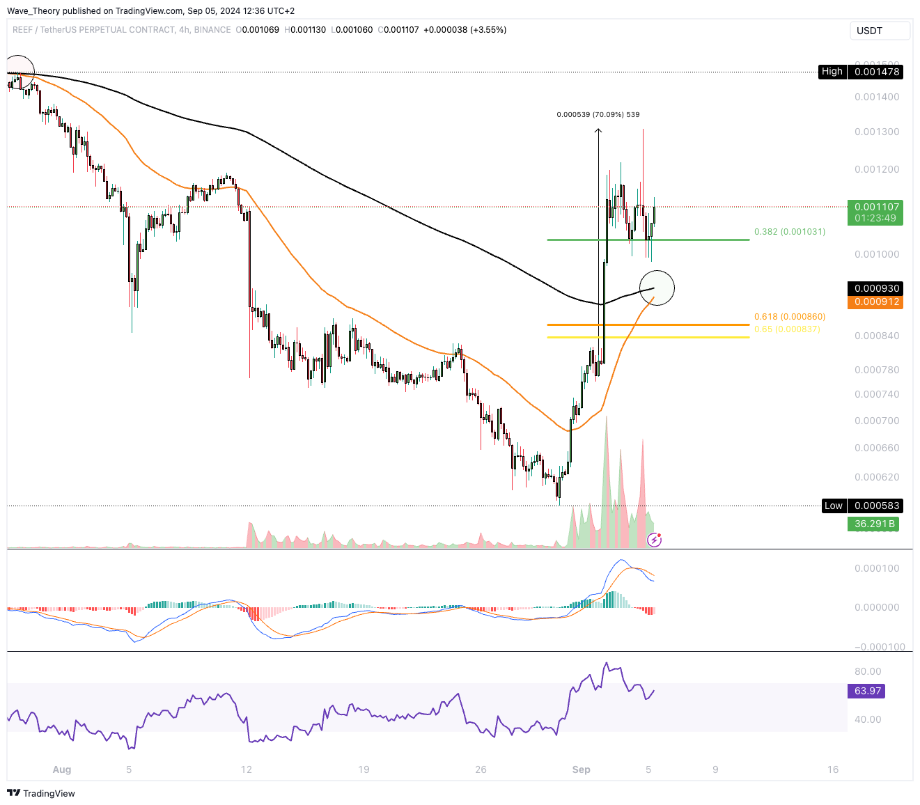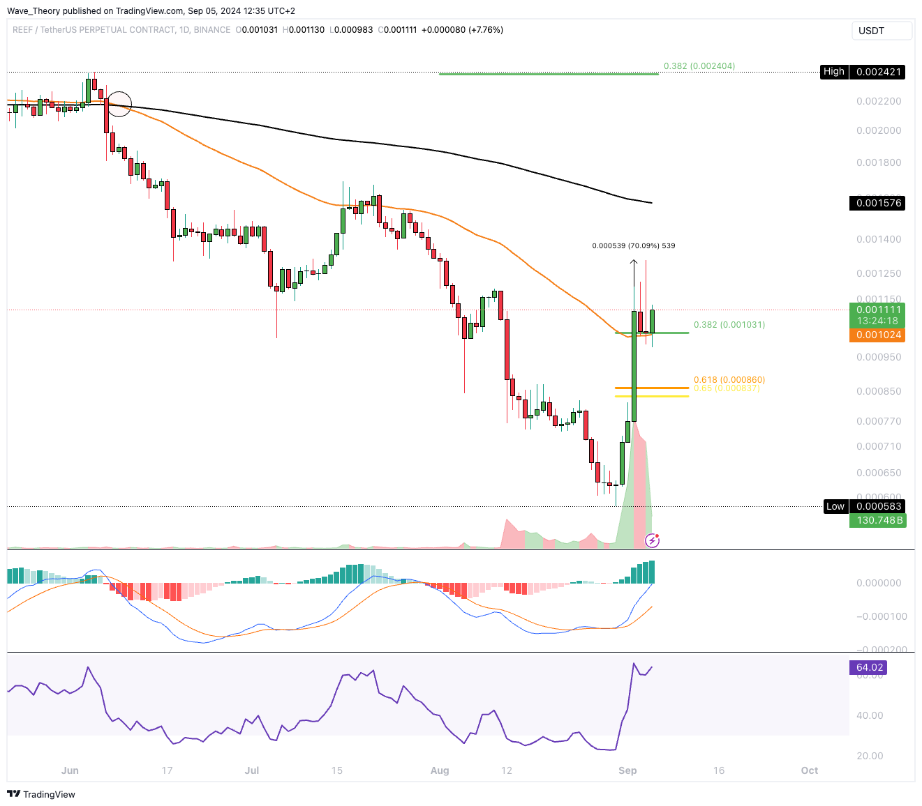Reef ist gestern zur 0,382 Fib Unterstützung am 50-Tage-EMA bei rund 0,001024 USD korrigiert. Dort scheint der Kurs heute bullisch abzuprallen.