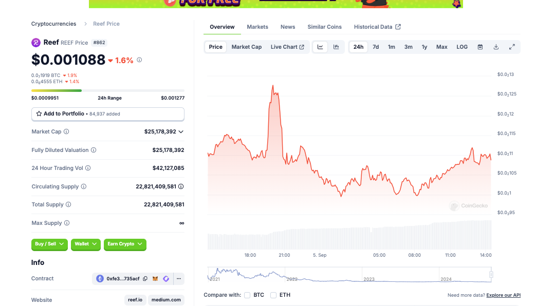 Mit einer Marktkapitalisierung von rund 25 Millionen USD befindet sich Reef (REEF) auf Platz 862 im Coingecko Ranking. Damit ist der Reef Coin noch sehr klein.