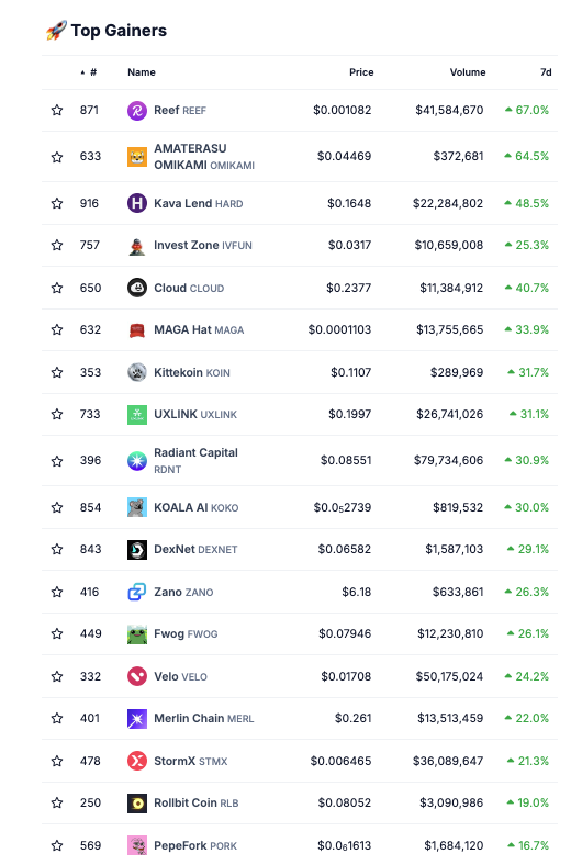 In den letzten sieben Tagen belegt Reef (REEF) den ersten Platz der Top-Kursgewinner auf dem Krypto-Markt. Laut Coingecko ist der Kurs in den letzten sieben Tagen rund 67 % gestiegen.