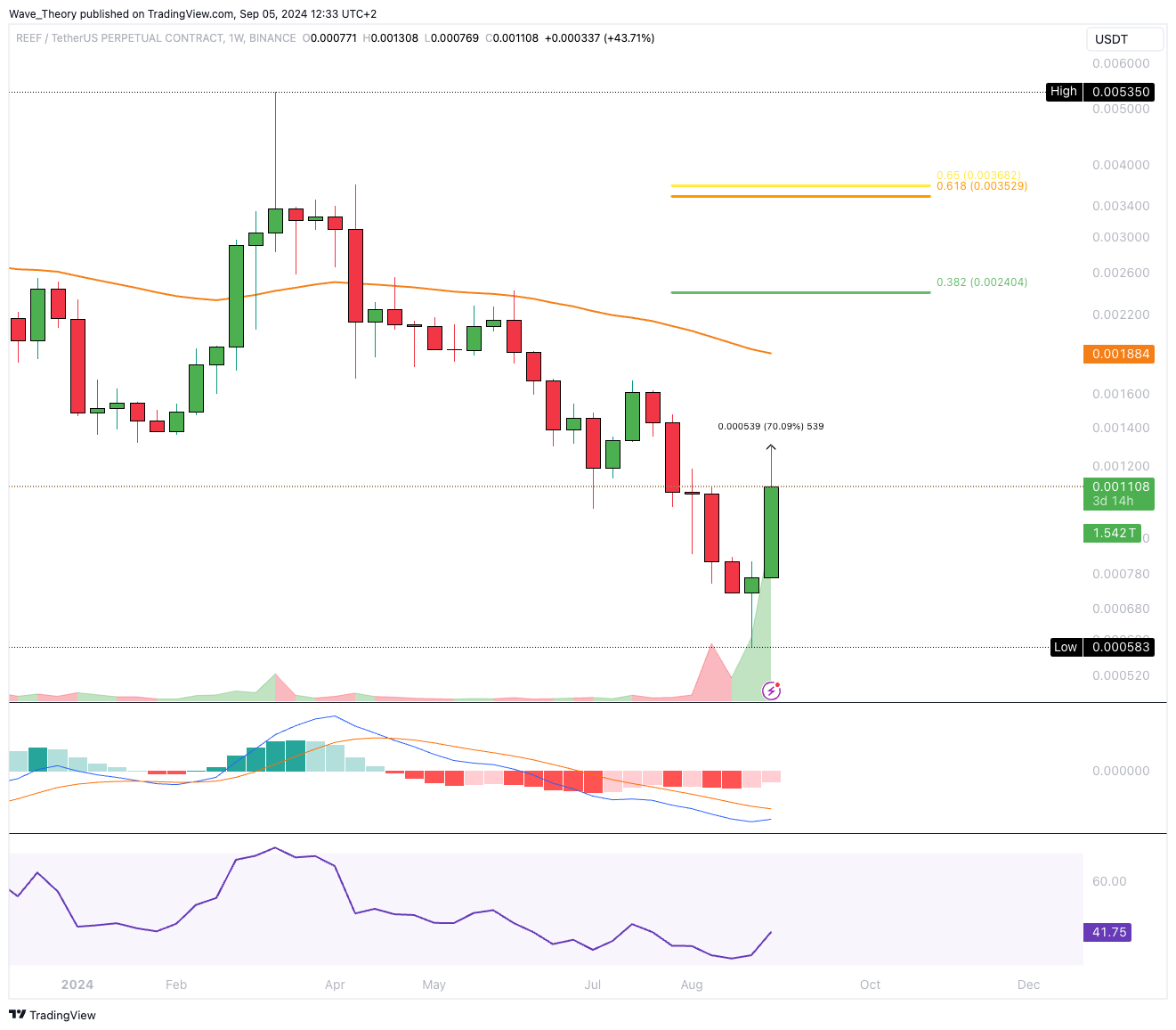 Die MACD Linien sind hingegen noch bärisch überkreuzt und der RSI zeigt sich neutral. Bevor Reef die Fib Widerstände erreicht, stößt er bereits bei rund 0,001884 USD auf signifikanten Widerstand.