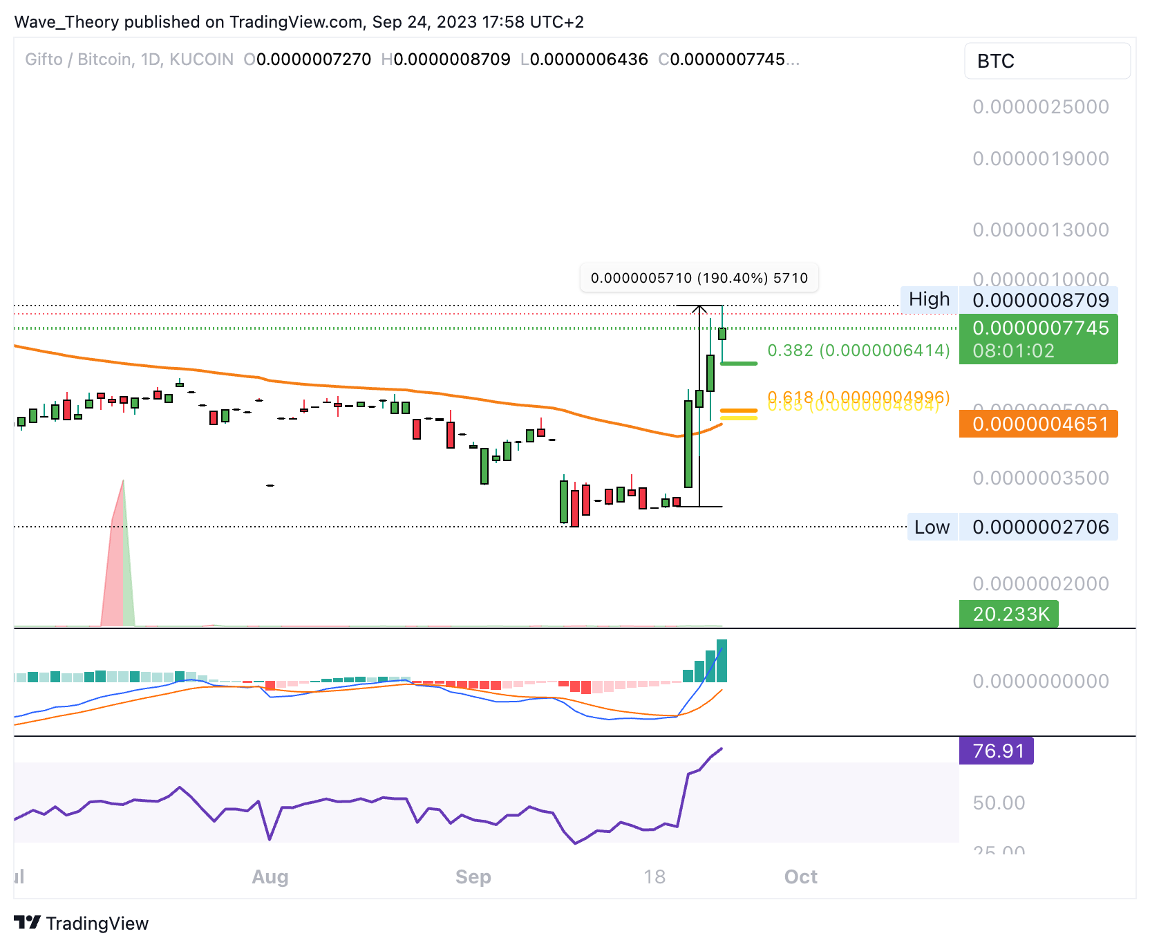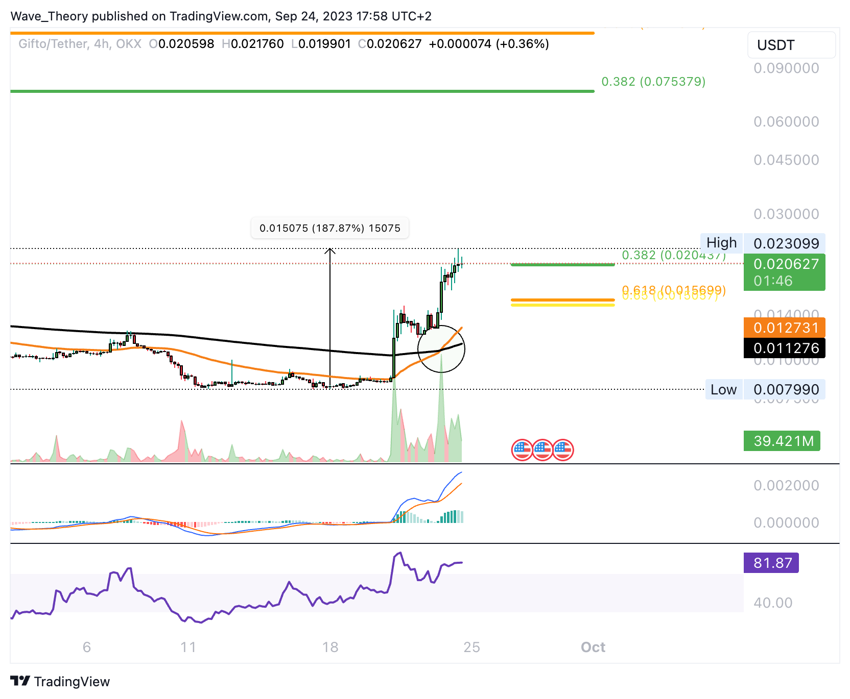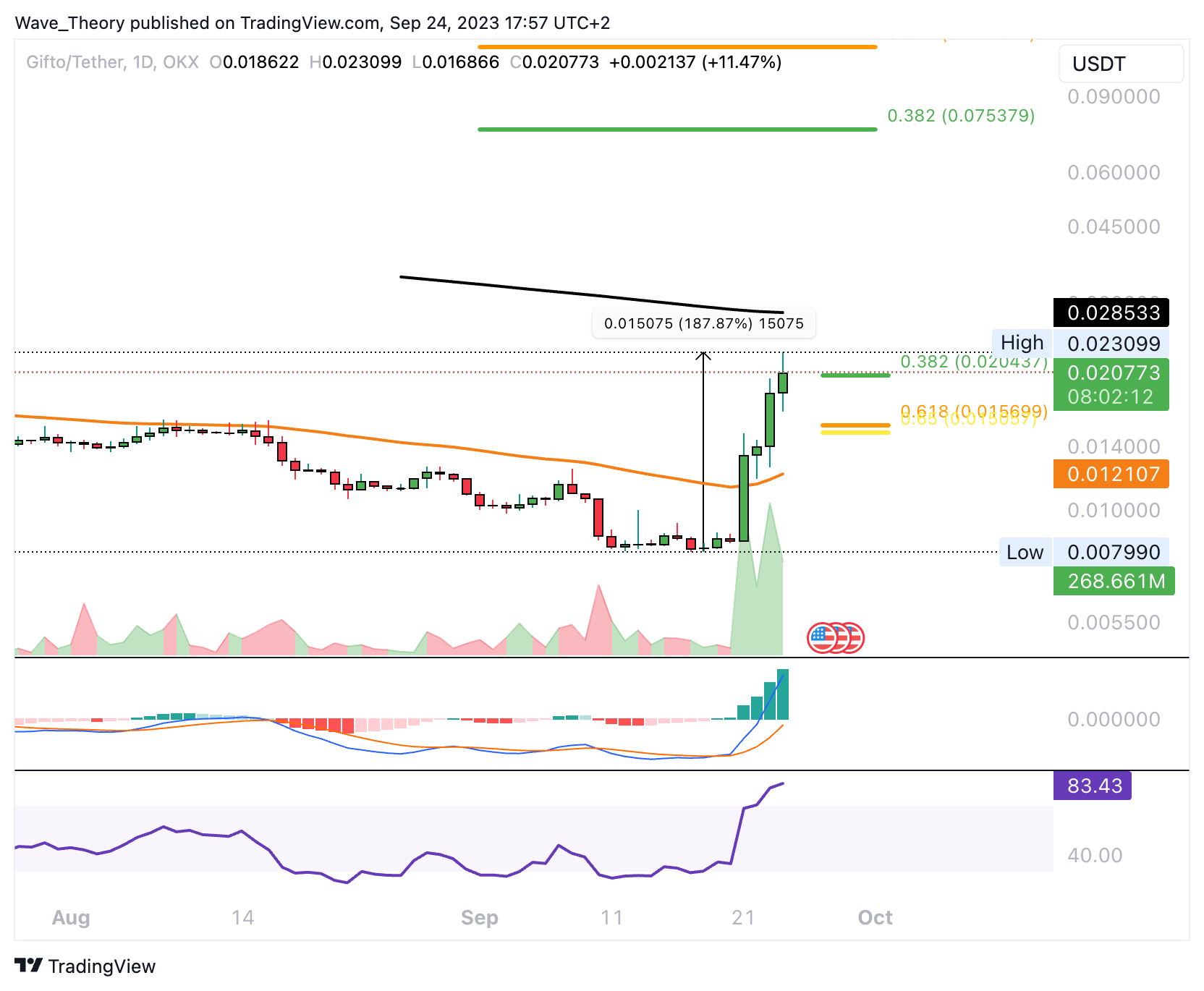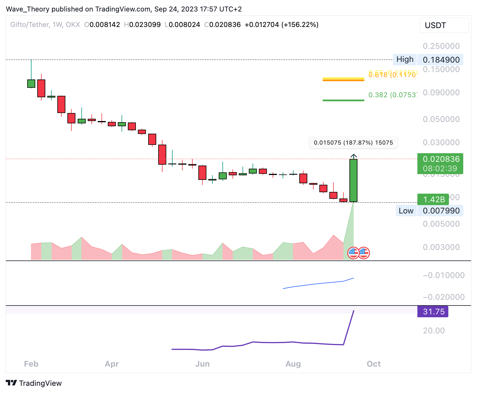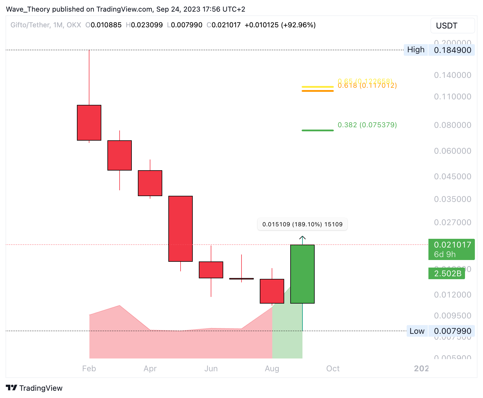 Auf OKX wird dieser Coin unter anderem am längsten gehandelt. Diese Woche ist die bullischste Woche, die dieser Coin seit Handlungsstart auf OKX je erlebt hat. Die nächsten signifikanten Fibonacci Widerstände sind dabei aber noch weit entfernt, denn diese liegen bei rund 0,075 USD und 0,12 USD. Tatsächlich befindet sich Gifto seit Handlungsstart auf OKX in einem massiven Abwärtstrend.