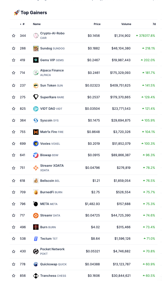 Auf Platz 1 liegt Crypto-AI-Robo, welcher aber nur ein Handelsvolumen von 1,3 Millionen USD aufweist. Das ist definitiv zu wenig Liquidität, weshalb wir diesen außer Acht gelassen haben.