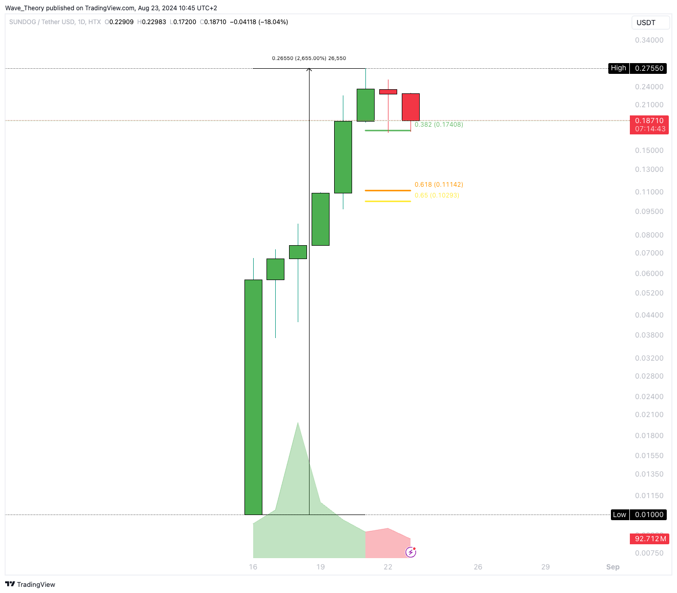 Auf Tradingview wird ersichtlich, dass der Sundog Coin auf der Krypto-Börse HTX seit letzten Freitag rund 2.655 % im Kurs steigen konnte. Seit vorgestern befindet sich Sundog aber in einer Korrekturbewegung.