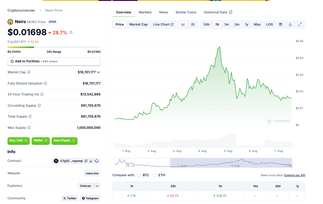 In den letzten sieben Tagen belegt Neiro (NEIRO) den ersten Platz der Top-Kursgewinner auf dem Krypto-Markt. Laut Coingecko ist der Kurs in den letzten sieben Tagen rund 228 % gestiegen.