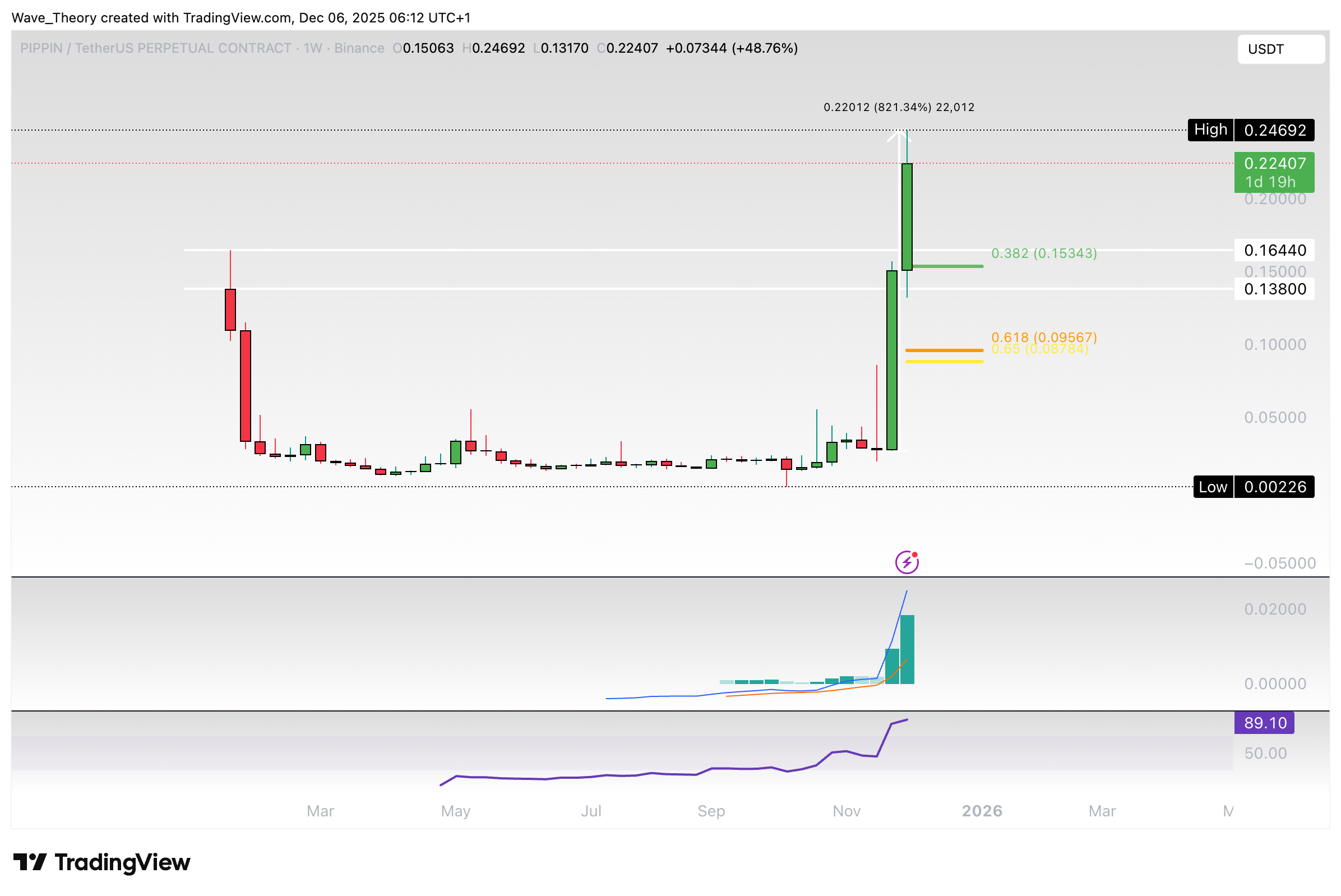 Alleine in den letzten zwei Wochen ist der Coin rund 821 % im Kurs gestiegen. Damit tickt das Histogramm des MACDs seit letzter Woche bullisch höher und die MACD Linien sind bullisch überkreuzt.
