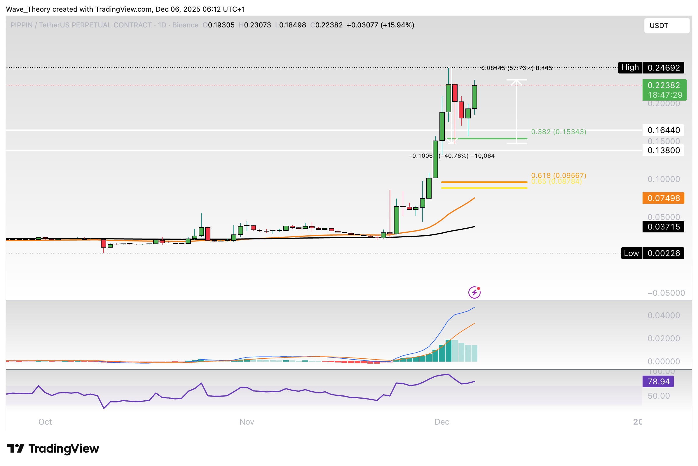 Doch bei rund 0,153 USD konnte der Kurs an der 0,382 Fibonacci Unterstützung bullisch abprallen und rund 58 % steigen. Damit könnte der Kurs jetzt das ATH bei rund 0,247 USD anvisieren oder gar übersteigen.