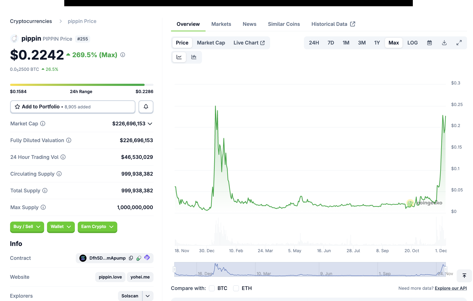 Mit einer Marktkapitalisierung von rund 227 Millionen USD befindet sich pippin (PIPPIN) auf Platz 225 im Coingecko Ranking. Damit ist der Coin noch sehr klein.