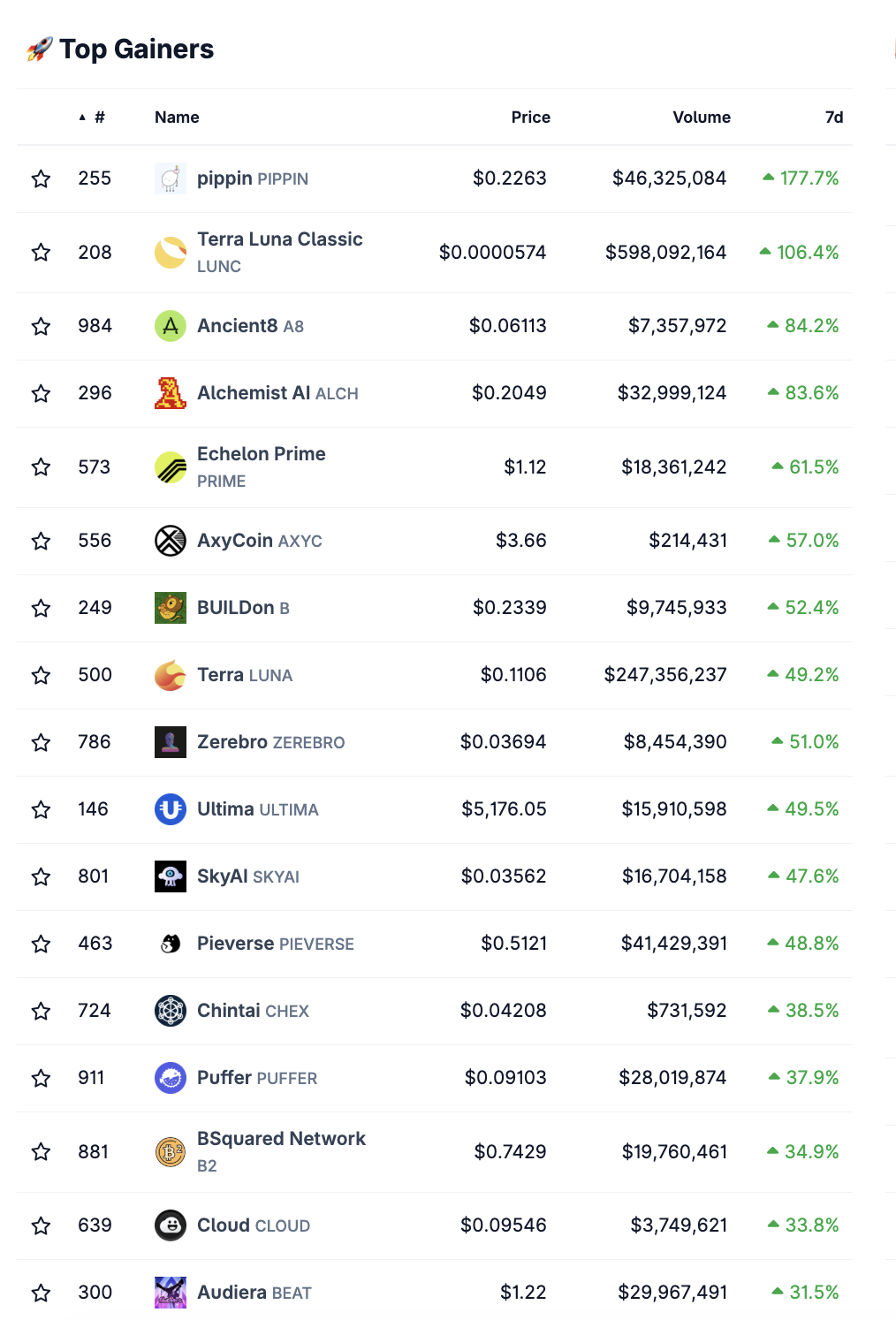 Der Coin pippin (PIPPIN) belegt in dieser Woche den ersten Platz der Top-Gewinner auf dem Krypto-Markt. Laut Coingecko ist er innerhalb der letzten sieben Tage rund 178 % im Kurs gestiegen.