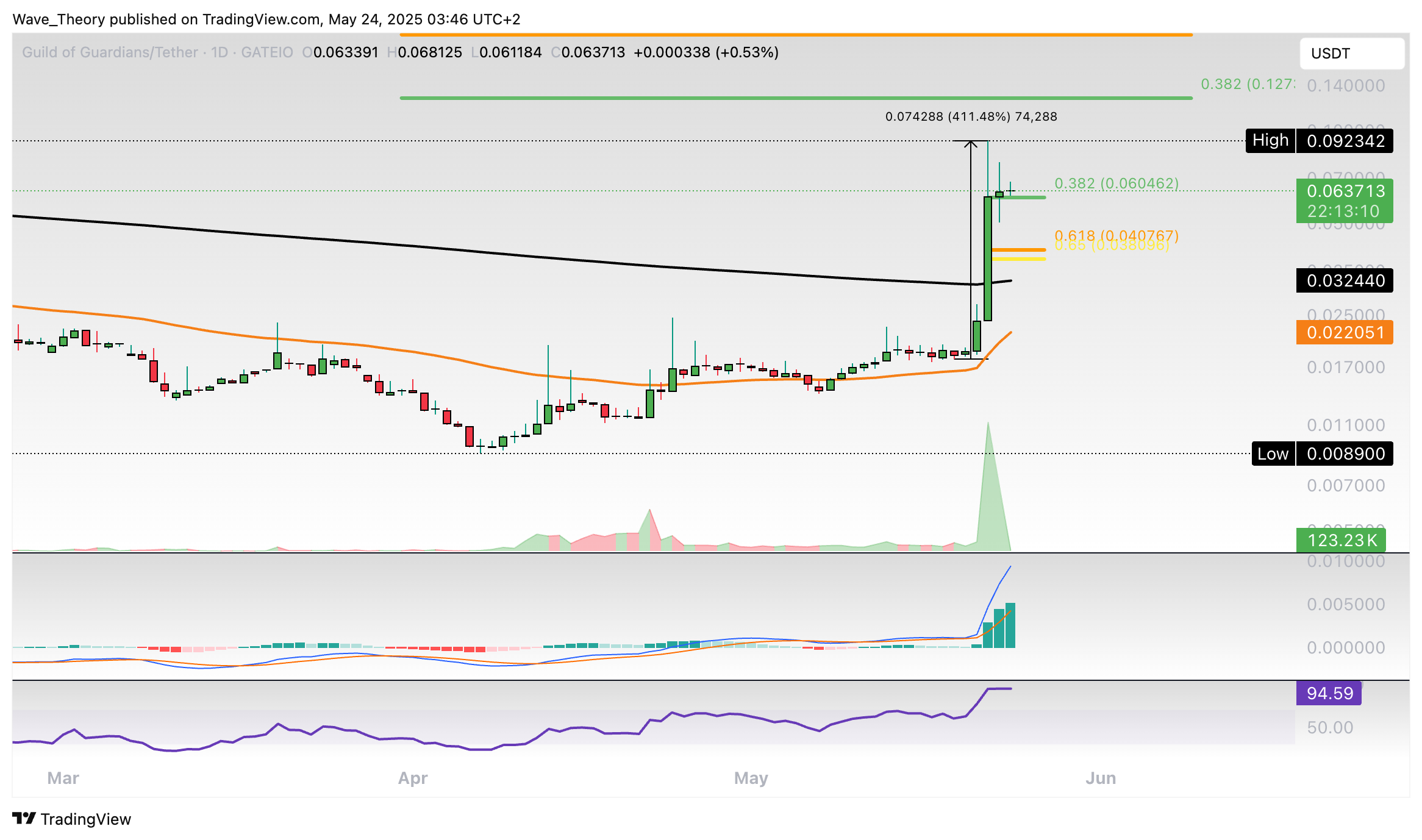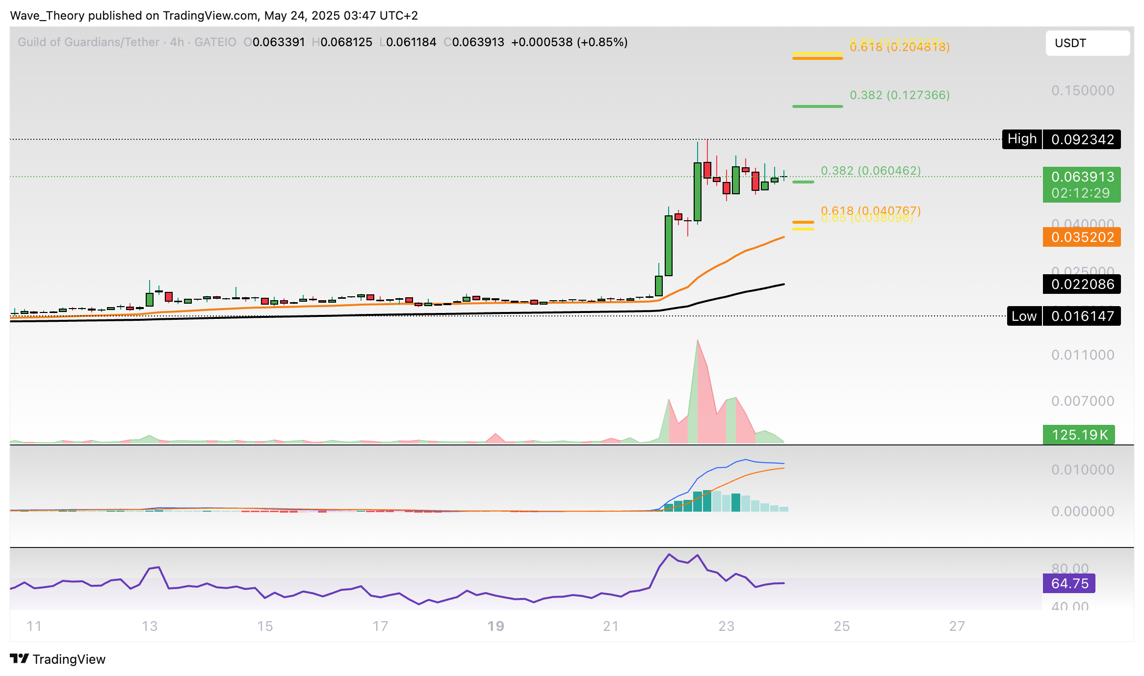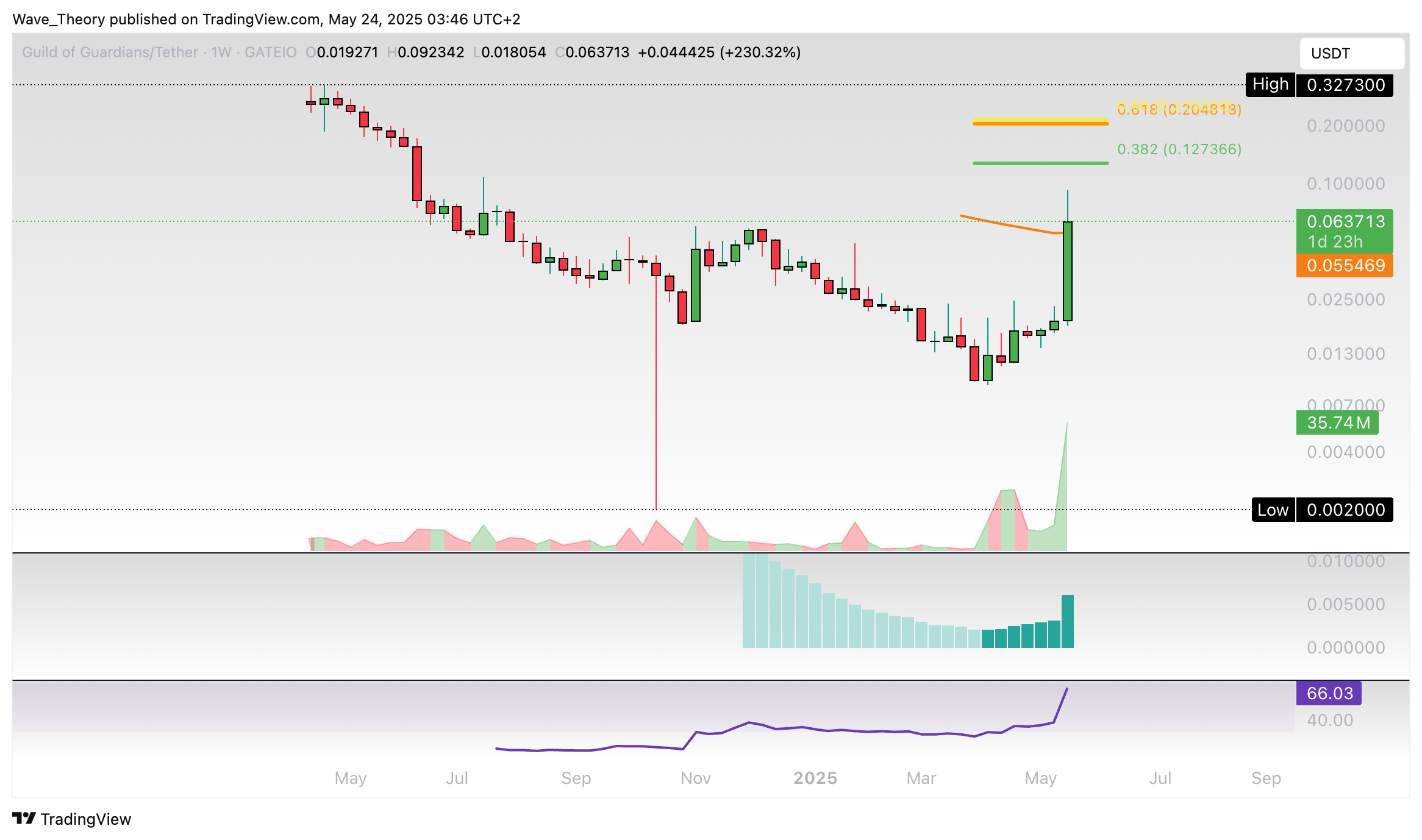 Wenn der Kurs jetzt den 50-Wochen-EMA bei rund 0,055 USD bricht, könnte er die Fib Widerstände bei rund 0,127 USD respektive 0,2 USD anvisieren.