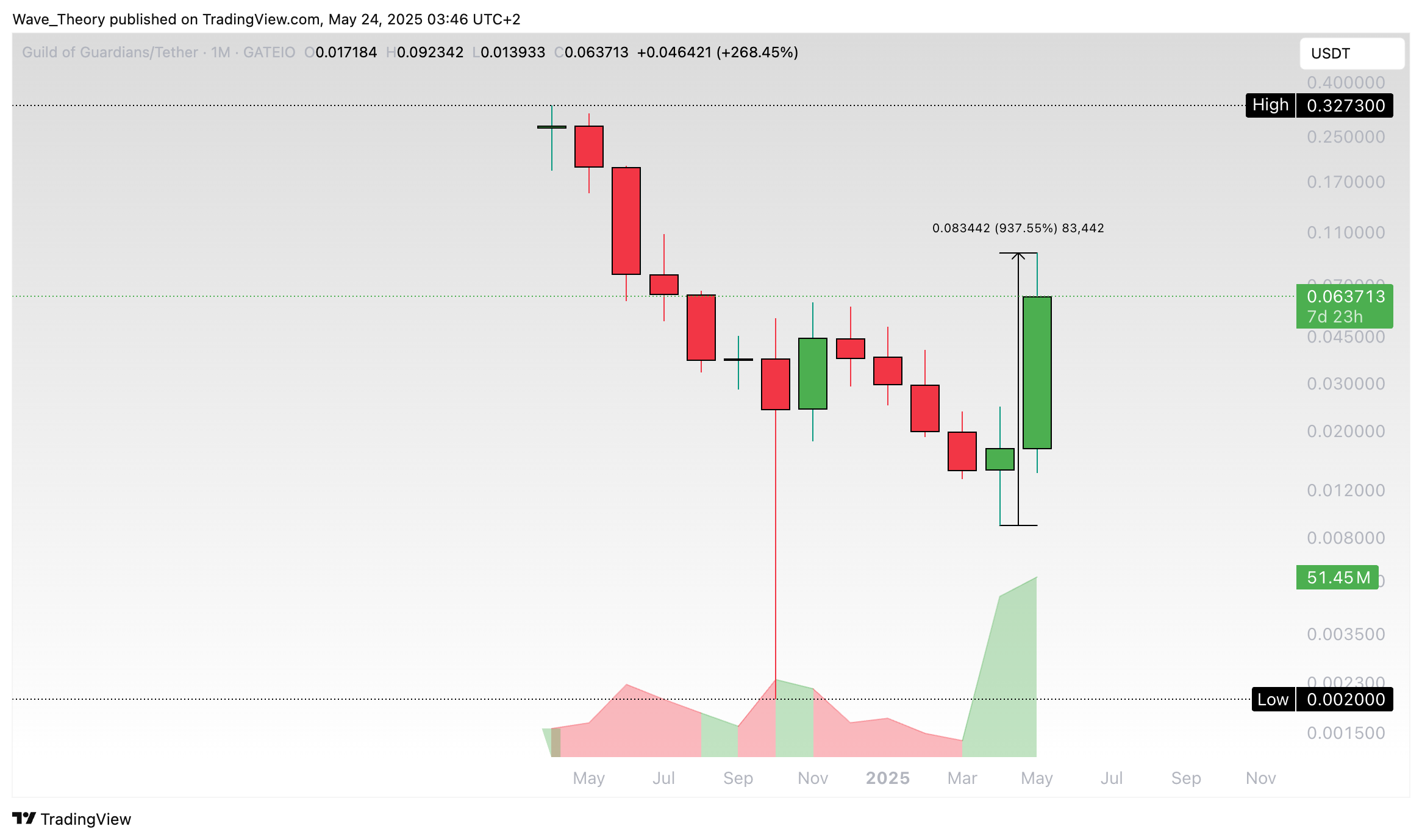Letzten Monat hat der Kurs eine Aufwärtsbewegung initiiert. Doch in diesem Monat ist der Kurs extrem stark angestiegen, womit er seit dem Tiefpunkt letzten Monat bereits über 937 % gestiegen ist.