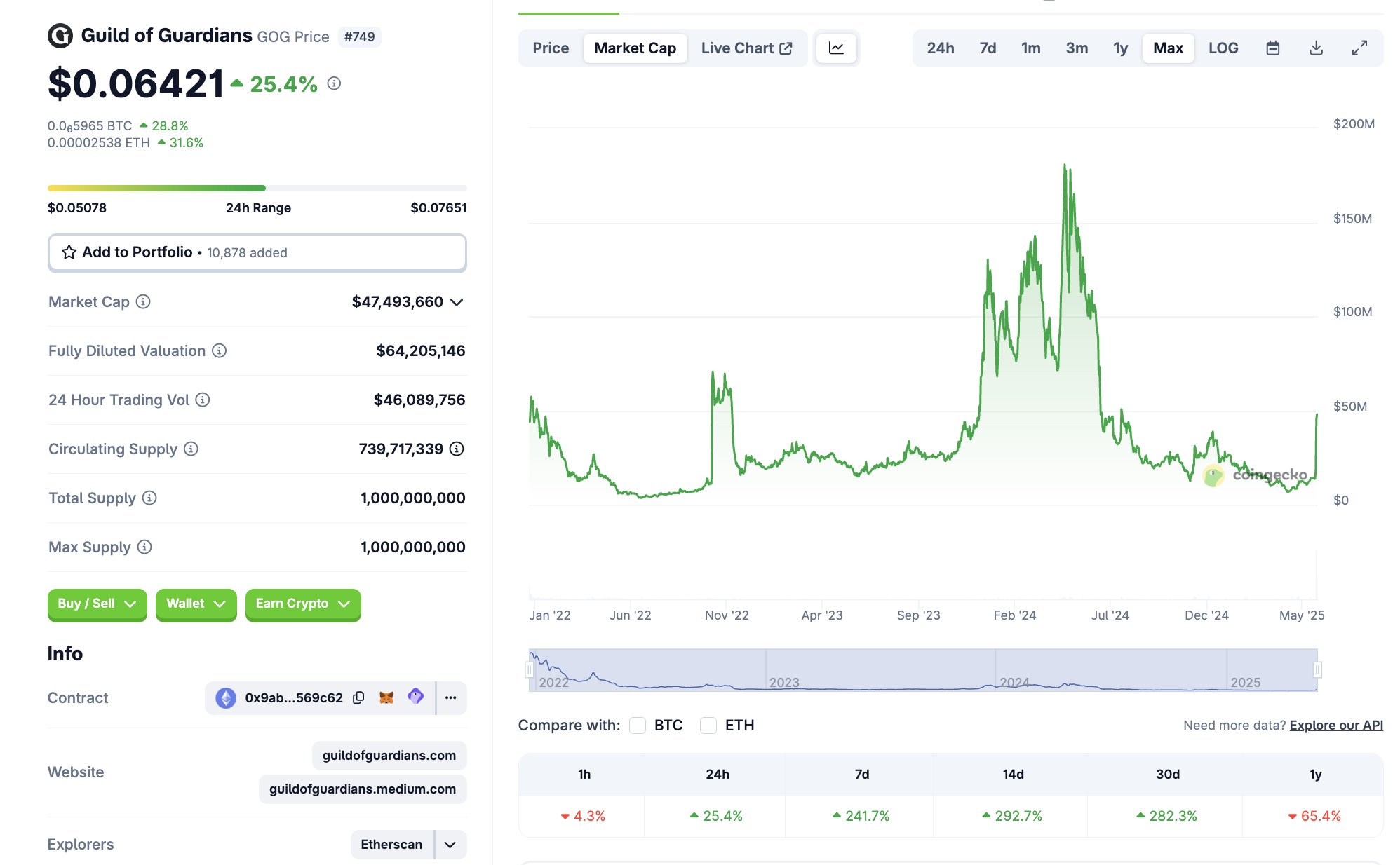 Mit einer Marktkapitalisierung von rund 47 Millionen USD befindet sich Guild of Guardians (GOG) auf Platz 749 im Coingecko Ranking. Damit ist der Coin noch sehr klein.